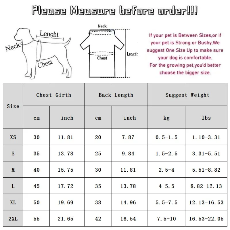XS: Pecho 30 cm/11,81 ''; Longitud 20 cm/7,87 ''; Peso sugerido 0,5-1,5 kg/1,10-3,31 lbs.