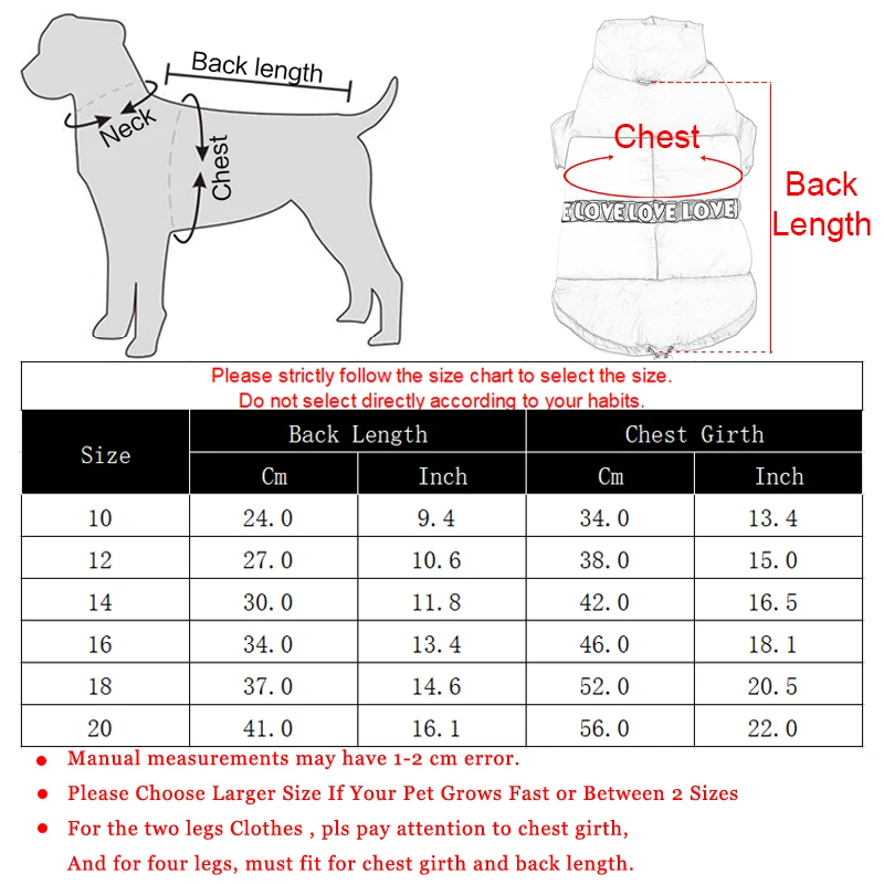 Elija una talla más grande si su mascota crece rápido o entre 2 tallas para la ropa de las dos piernas,