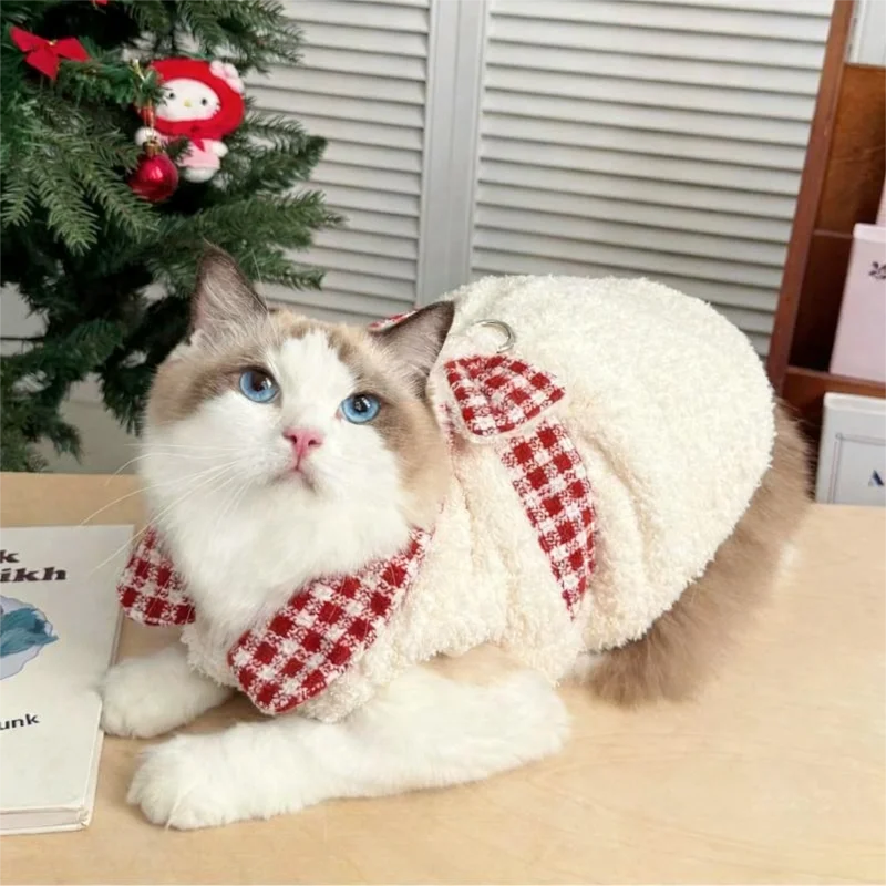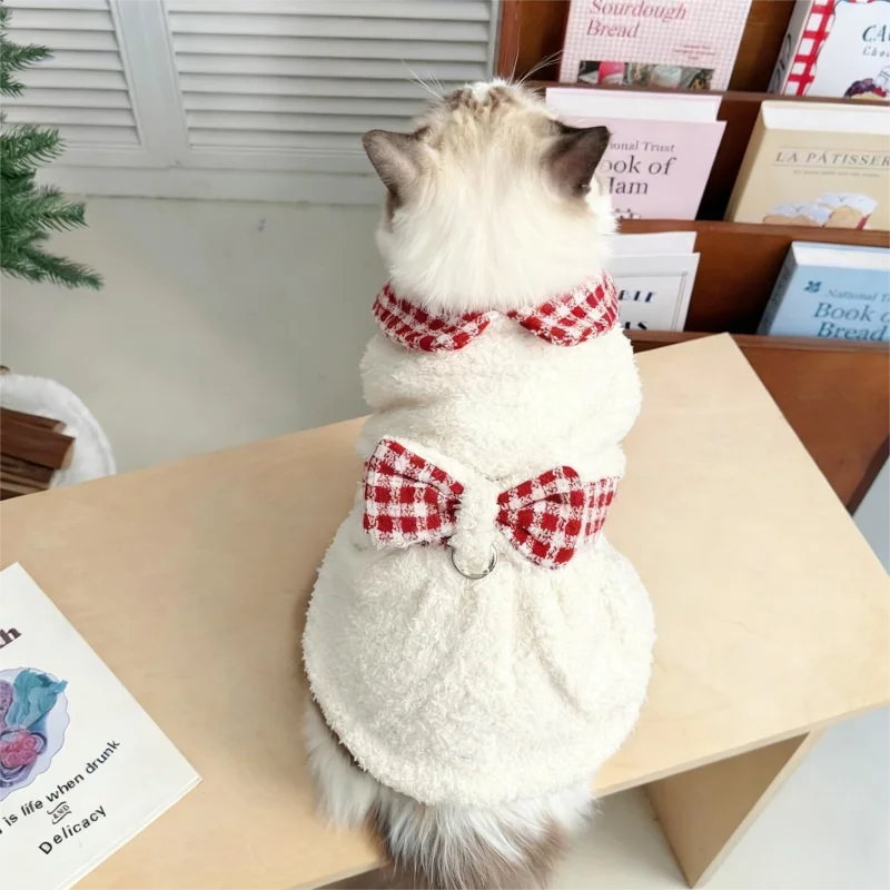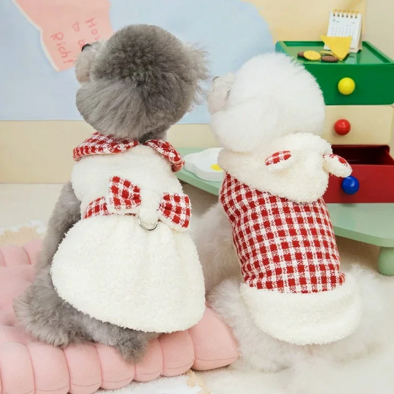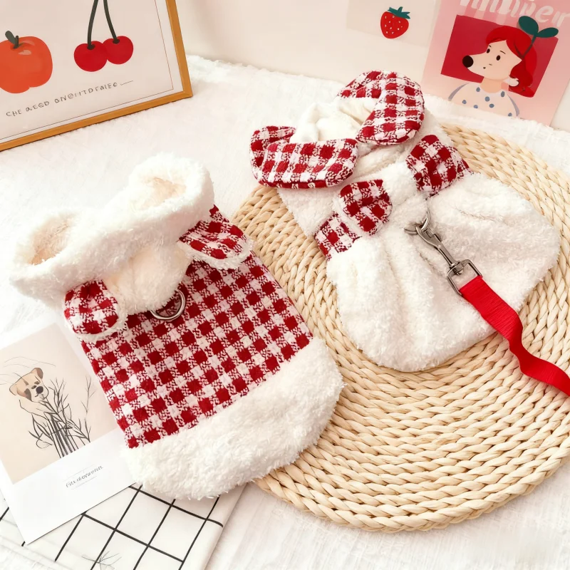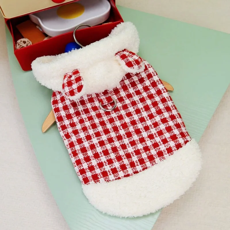 Chaqueta con capucha cálida de felpa para perro, vestido bonito con lazo para perro, abrigo, disfraz de invierno para cachorro, chaqueta roja a cuadros para gato, abrigo, cárdigan para mascota, ropa para perro
