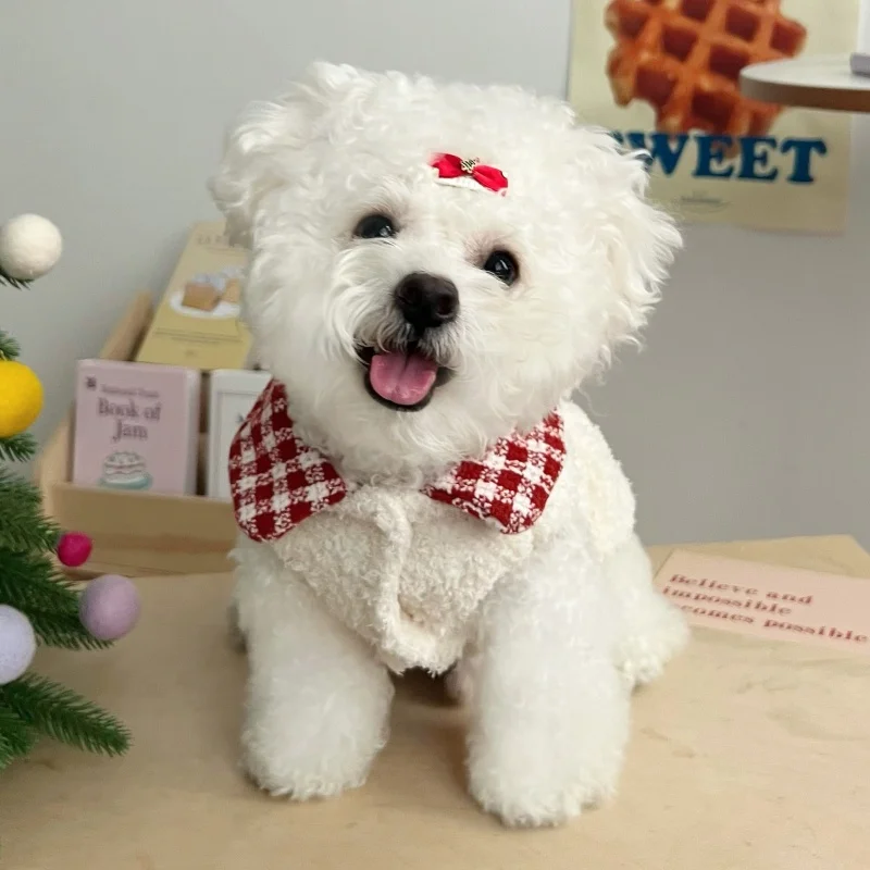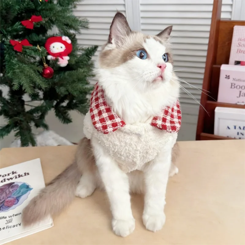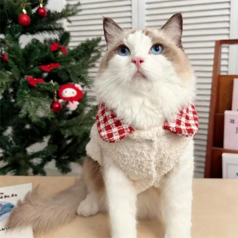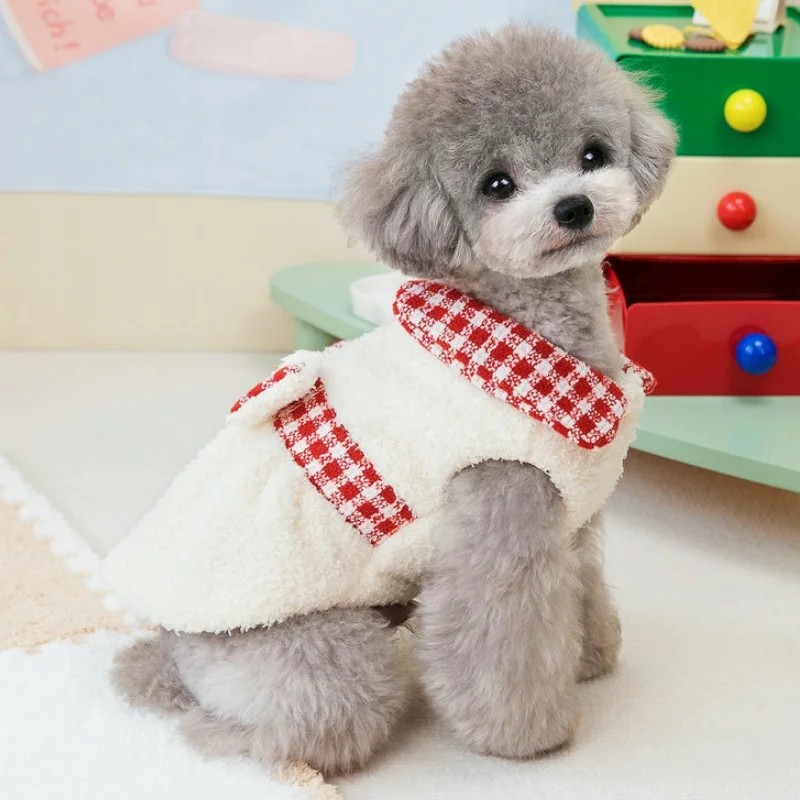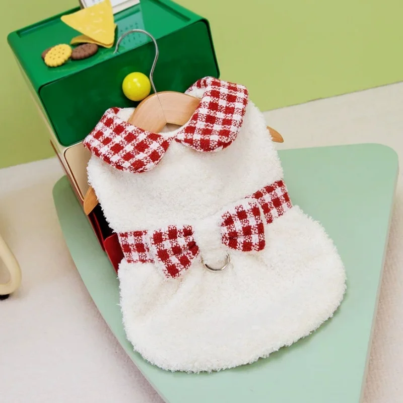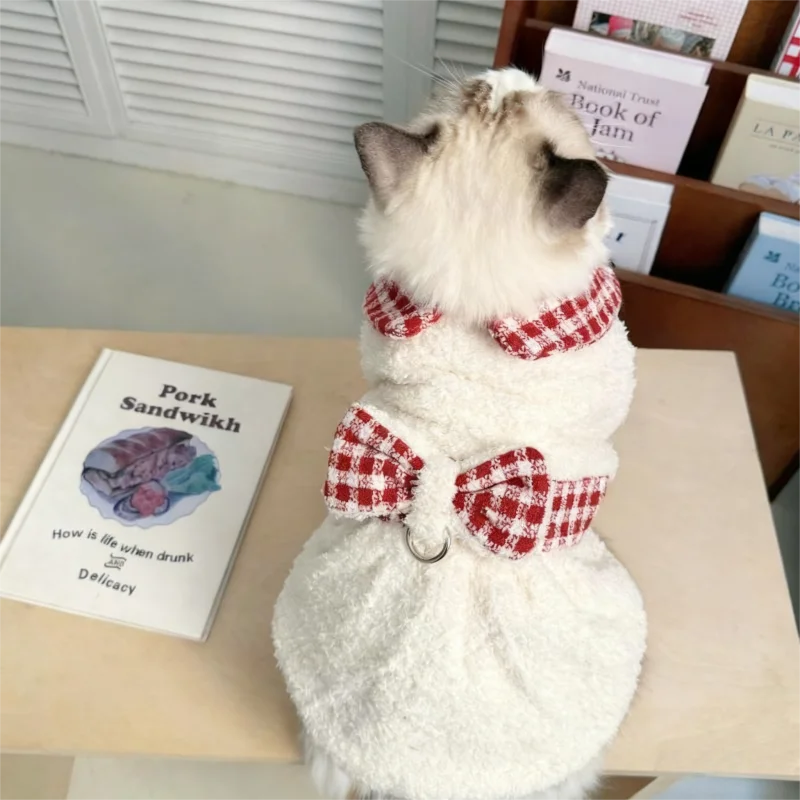 Chaqueta con capucha cálida de felpa para perro, vestido bonito con lazo para perro, abrigo, disfraz de invierno para cachorro, chaqueta roja a cuadros para gato, abrigo, cárdigan para mascota, ropa para perro