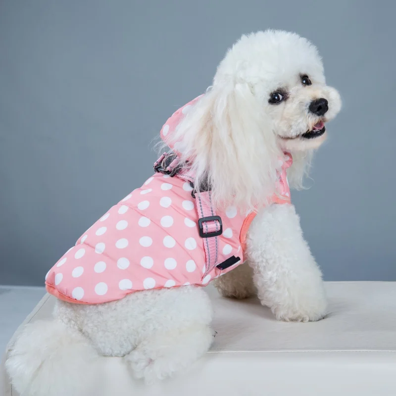 Chaqueta con capucha para mascotas, perros y cachorros con estampado de abrigo grueso, chaleco cálido con arnés y correa duradera para el pecho, 2 en 1, Otoño e Invierno