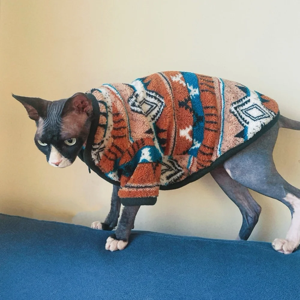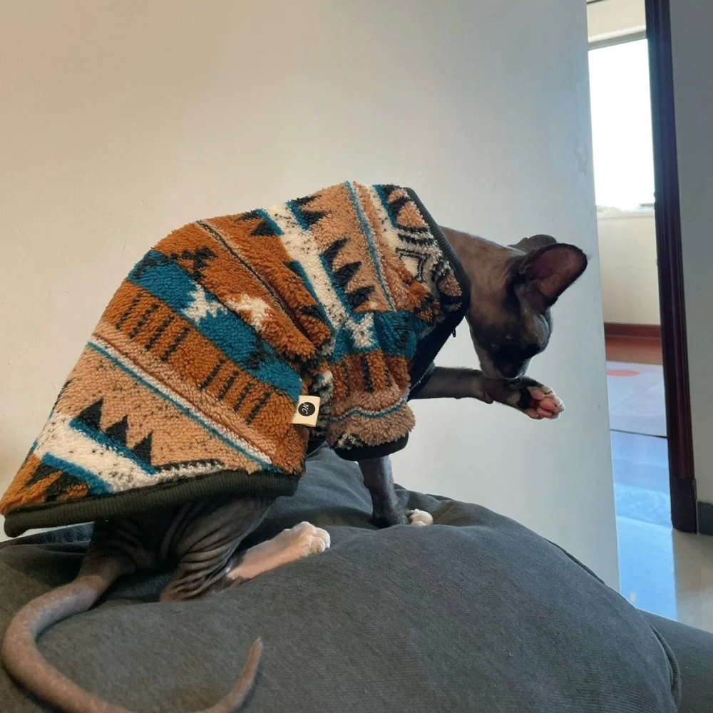 El gato se siente muy abrigado y cómodo, el tamaño le queda perfecto, no limita los movimientos, y el tejido en sí es agradable y suave.