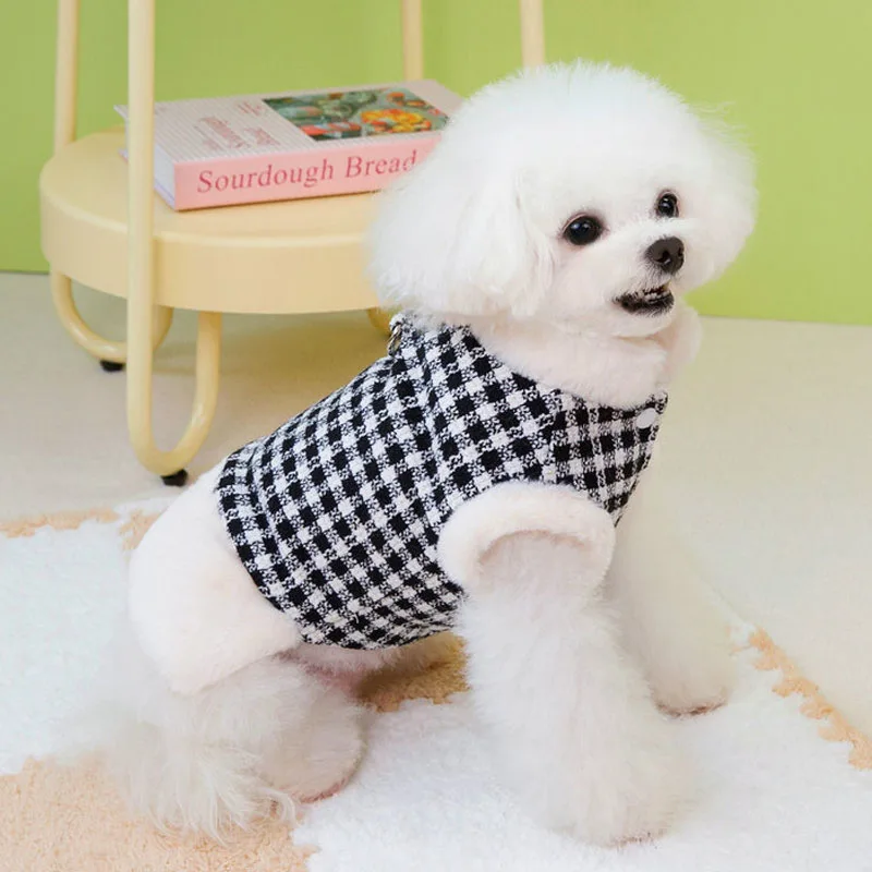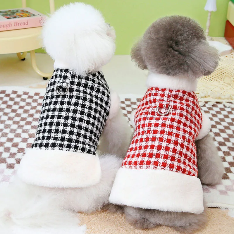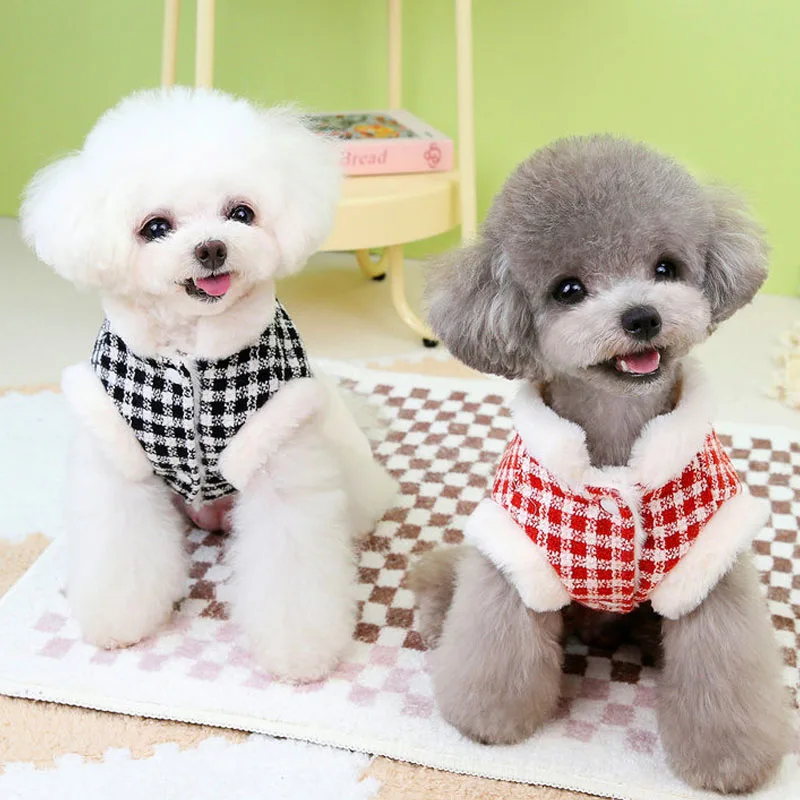 Chaqueta cálida de lujo para invierno, cuello de piel a cuadros rojo y negro, ropa de manga corta para mascotas para perros pequeños, disfraces de abrigo para cachorros Dachshund Yorks