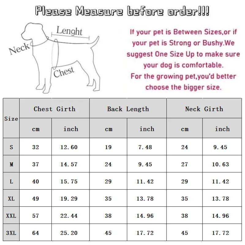 3XL: Pecho 64cm/25,20''; Longitud 45cm/17,72''; Cuello 45cm/17,72''
