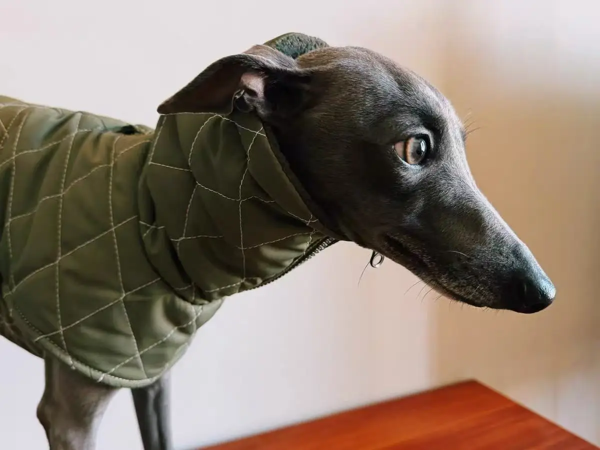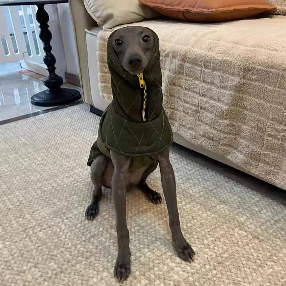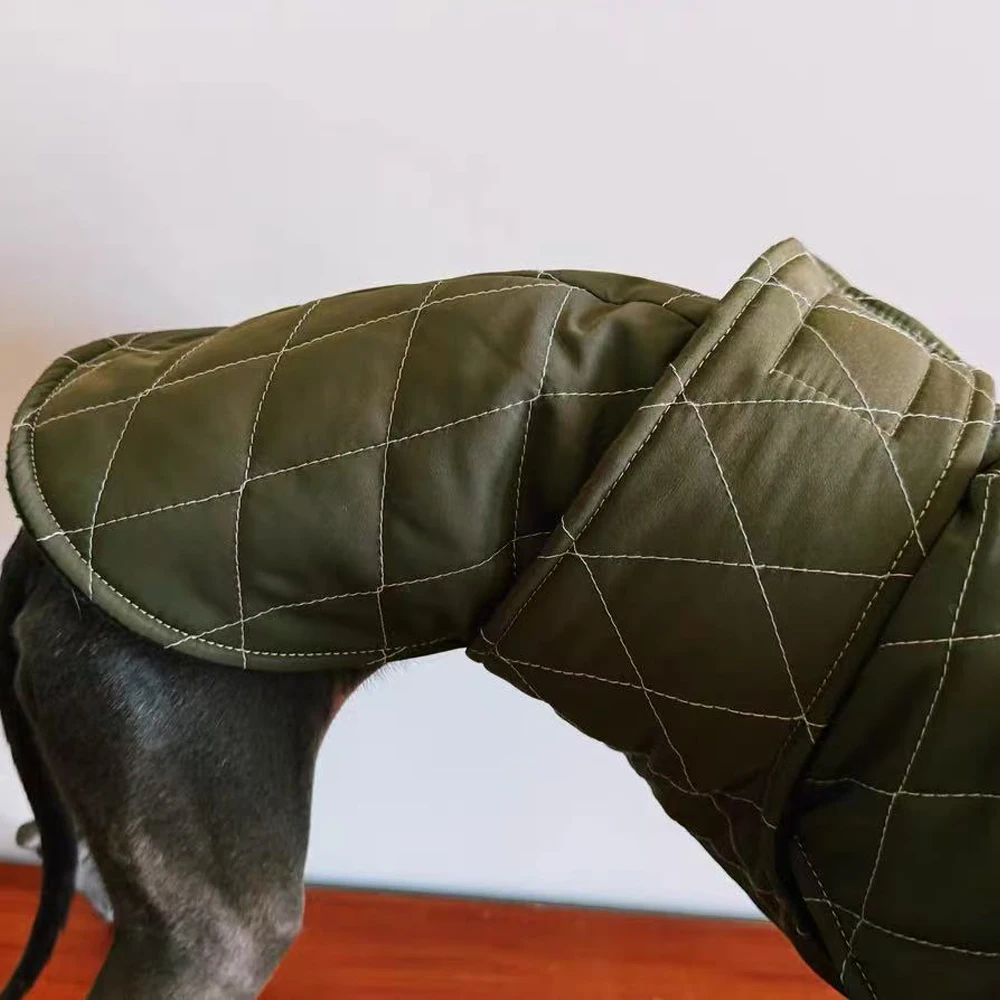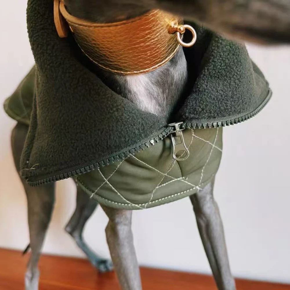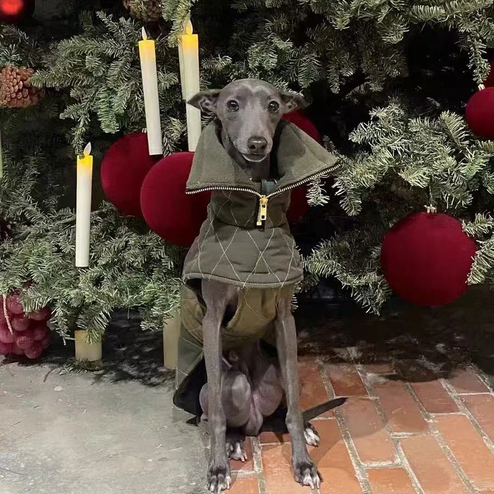 Chaqueta de corteza italiana con cintura ajustable verde militar, capa cálida de cuello alto a prueba de viento con ropa con cremallera para perro Whippet