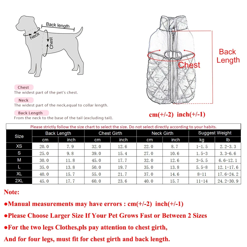 XS:Longitud 20 cm (7,9"), pecho 32 cm (12,6"), cuello 22 cm (8,7"), peso sugerido: 1-1,5 kg (2-2,3 lb);