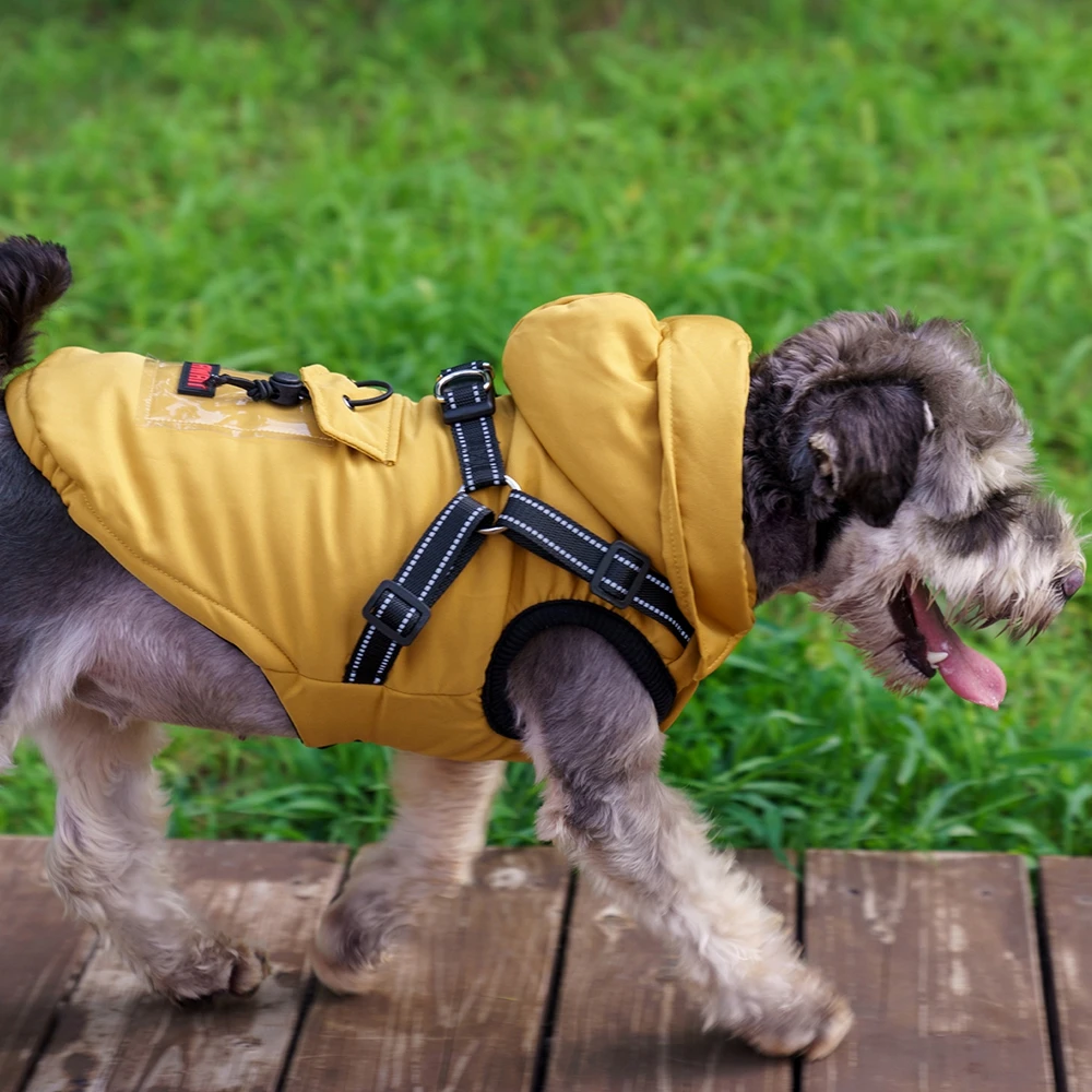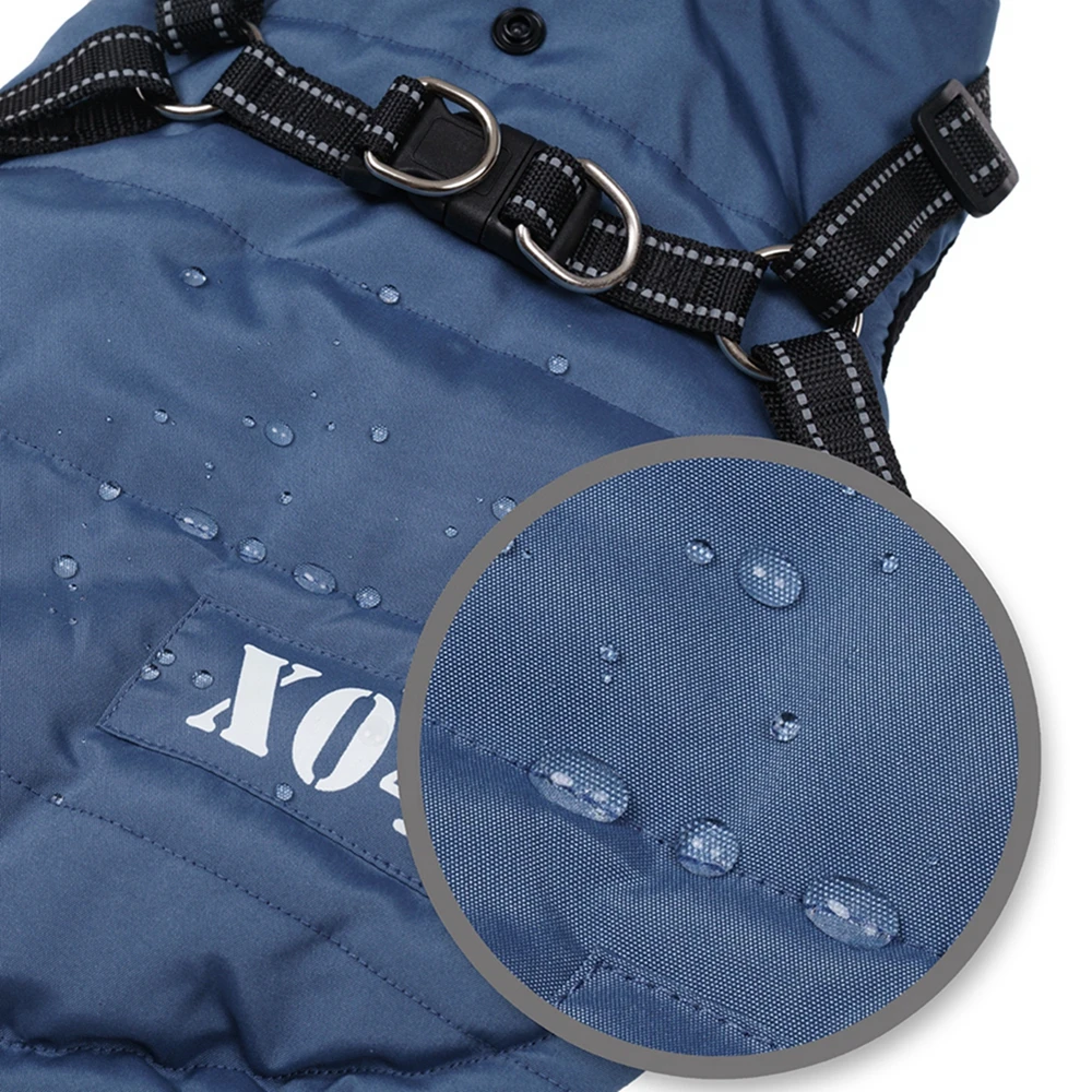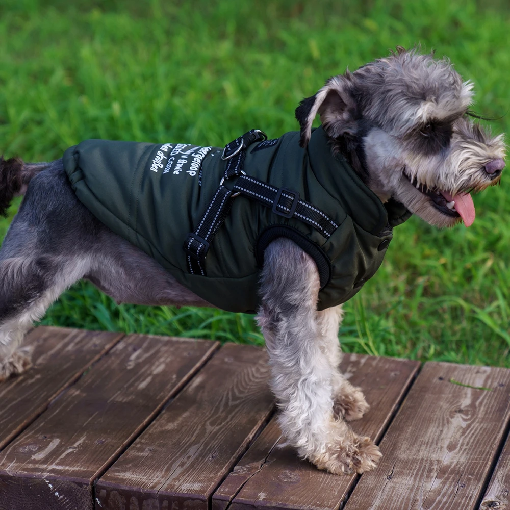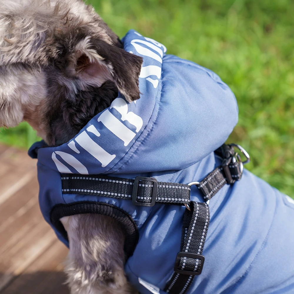 4. Use una cremallera en el pecho, y la espalda está unida al pecho y al cinturón de tela trasero, que no tirará de la ropa, no dañe el pelo del perro y juegue un papel apretado a prueba de viento y cálido