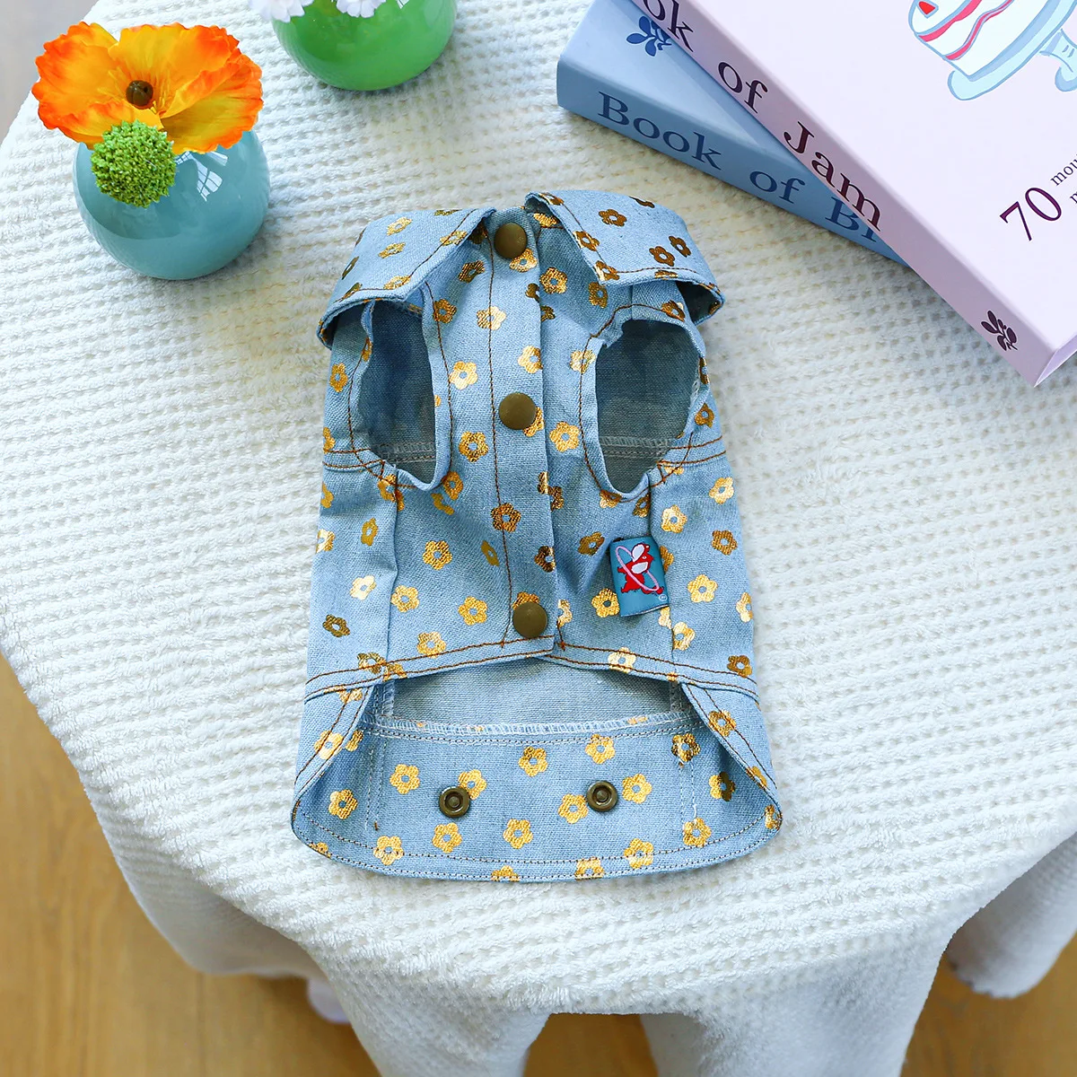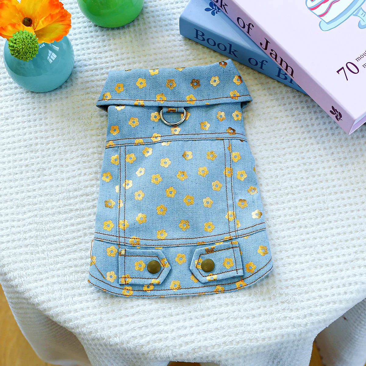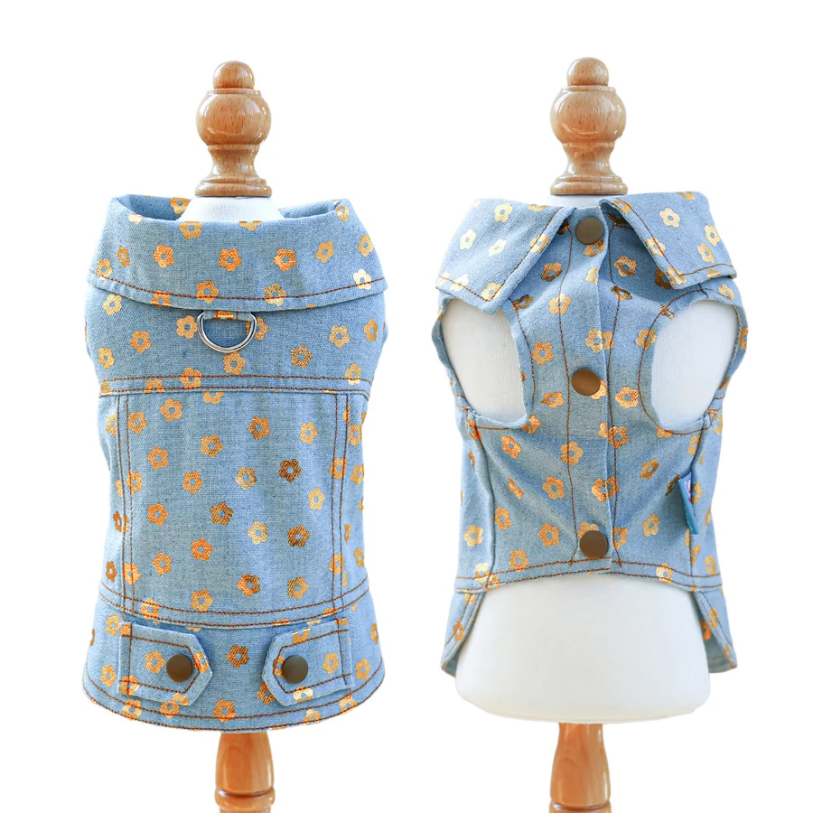 Chaqueta vaquera para perros con hebilla de tracción, estampado de flores cosido en oro, botón a presión, linda camisa vaquera para perros