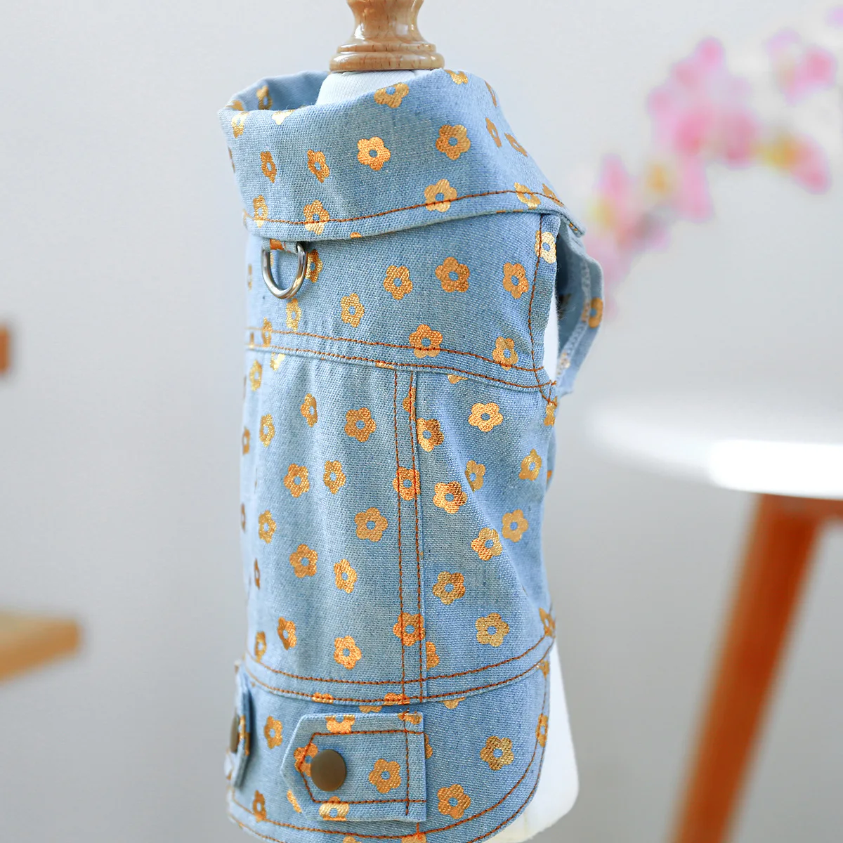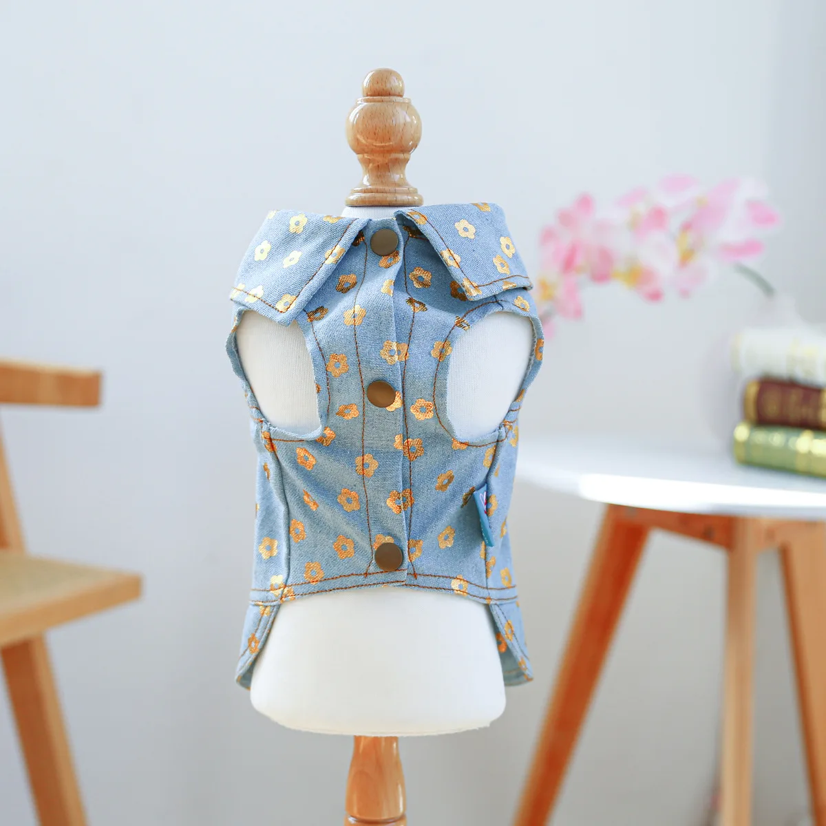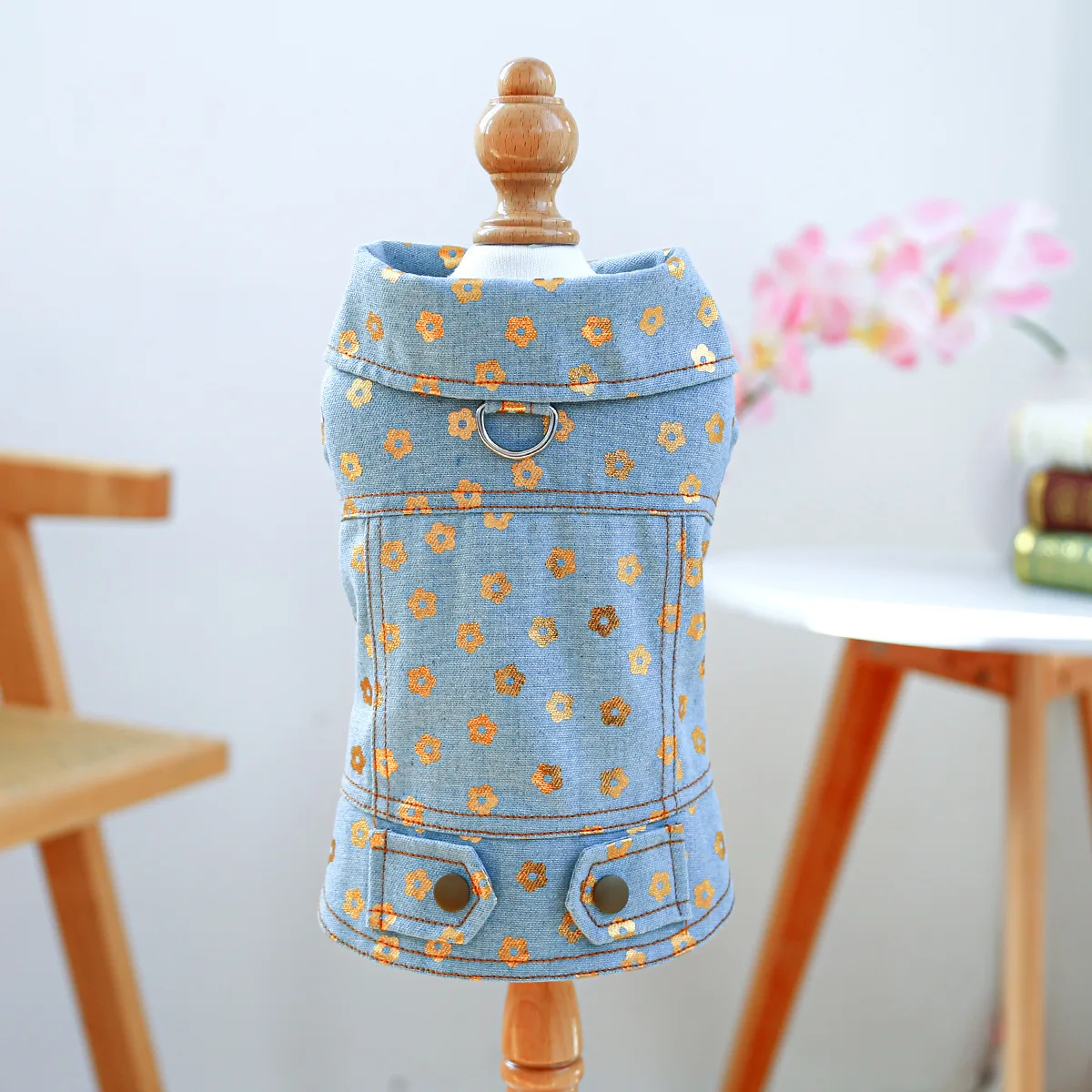 Chaqueta vaquera para perros con hebilla de tracción, estampado de flores cosido en oro, botón a presión, linda camisa vaquera para perros