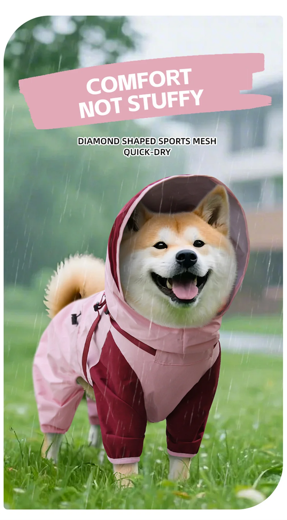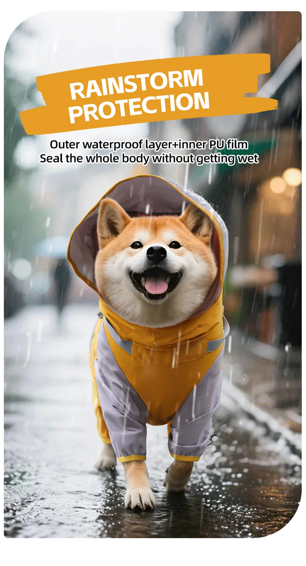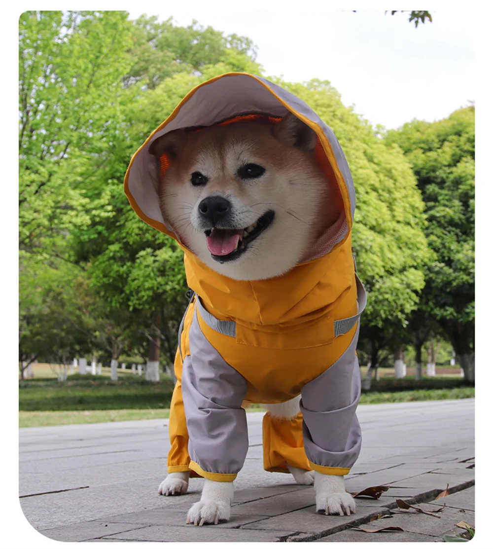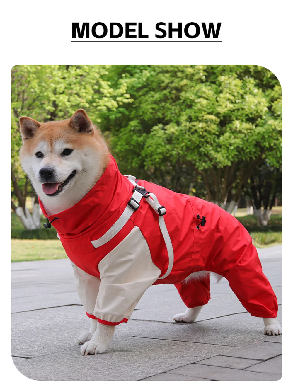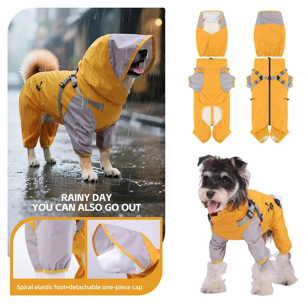 Chubasquero de doble capa para mascotas con arnés, malla interior exterior de PU, resistente al viento, impermeable, chaqueta para exteriores para mascotas de cuatro patas, sombrero desmontable