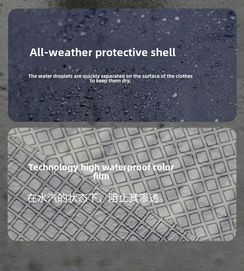 Características: 1.Actualice el cordón ajustable con capucha para optimizar la adaptación de la cabeza 2.Actualice el diseño de la cintura para reducir las salpicaduras de agua de lluvia en el proceso dinámico 3.Actualice la tira de cubierta de cremallera impermeable, combinada con unión de velcro, doble garantía de impermeabilidad