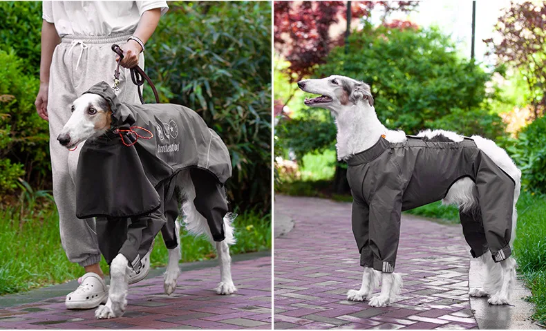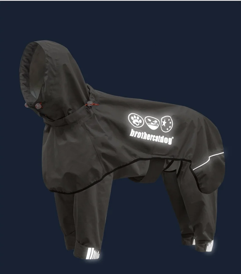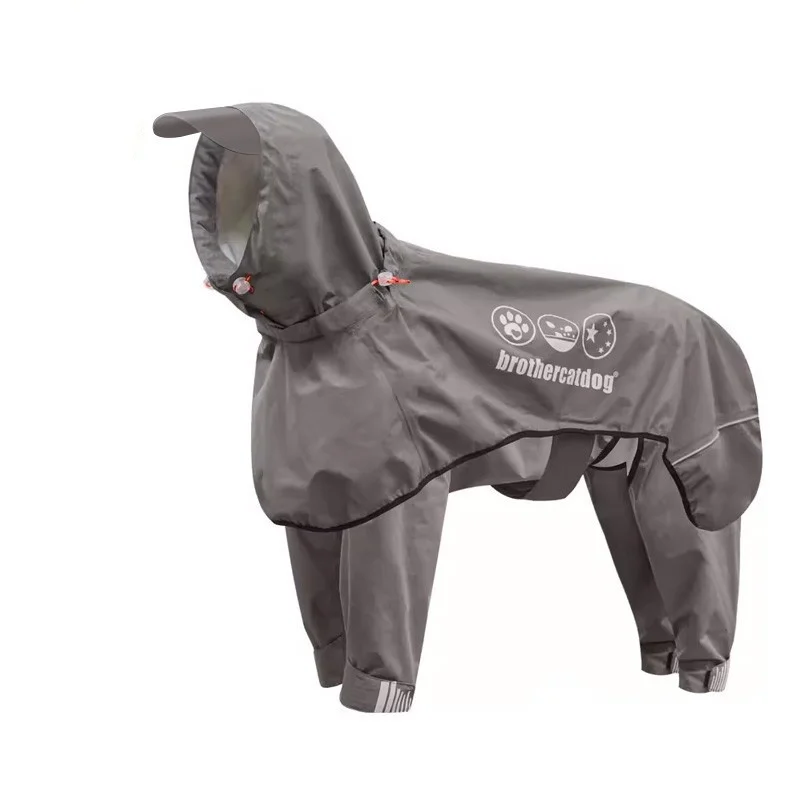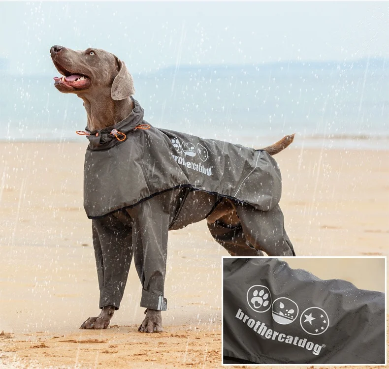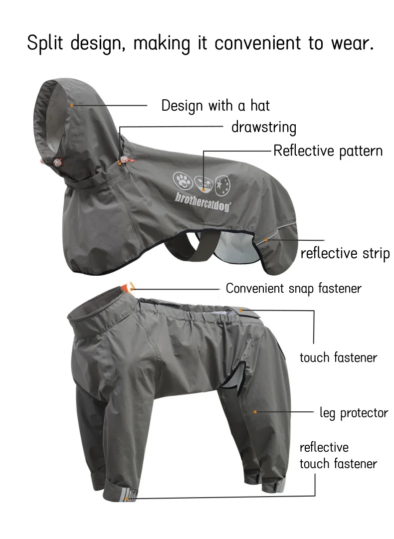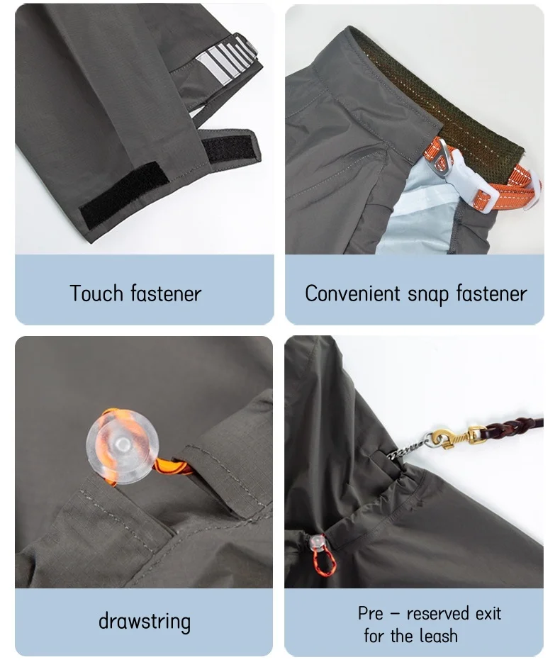 Este impermeable de alta gama para perros grandes es un diseño original creado de forma independiente por nuestra empresa. Presenta un diseño dividido, una capucha y una cubierta para la lluvia. Hay un cordón alrededor del cuello y también está equipado con una ranura para sujetar una correa. Tiene elementos reflectantes para mejorar la visibilidad por la noche. El impermeable es ligero y transpirable, lo que te permite pasear a tu perro libremente incluso en días lluviosos. Está diseñado específicamente para dueños de perros que valoran la calidad.