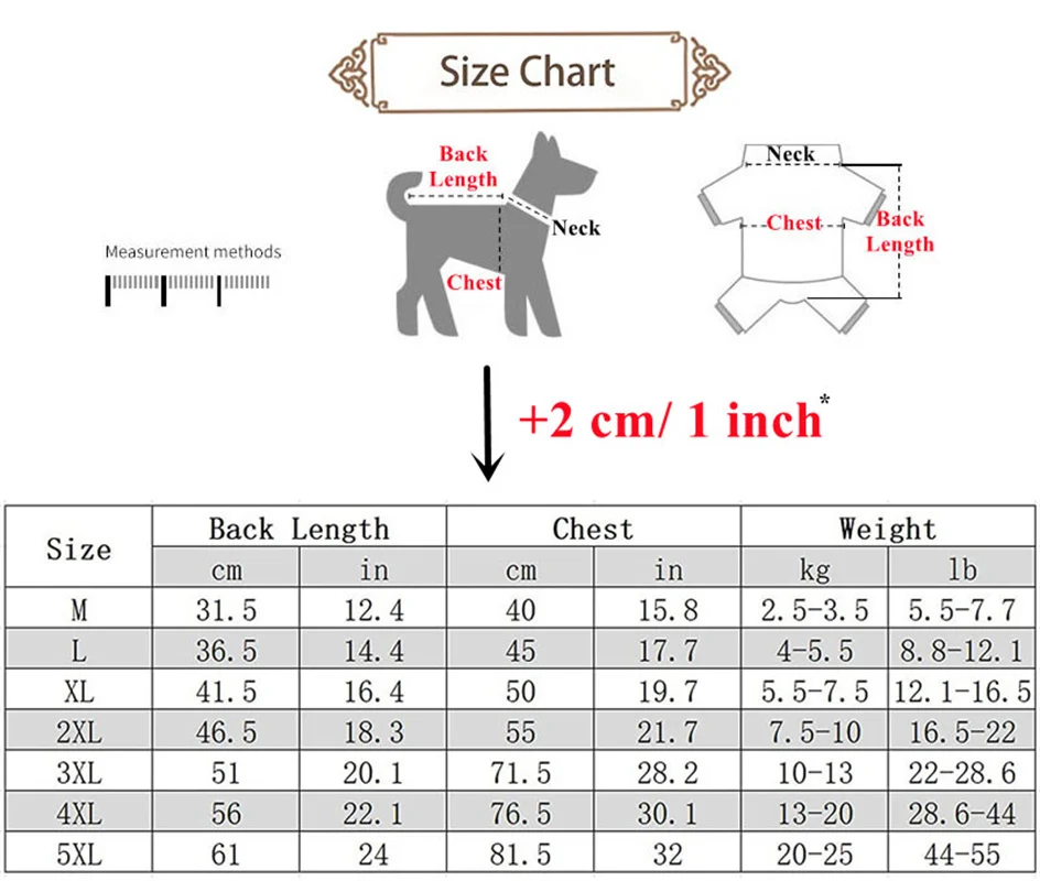 *El tamaño de la ropa recomendada es 2-3 cm (0,8-1,2 pulgadas) más grande que el tamaño real del perro.