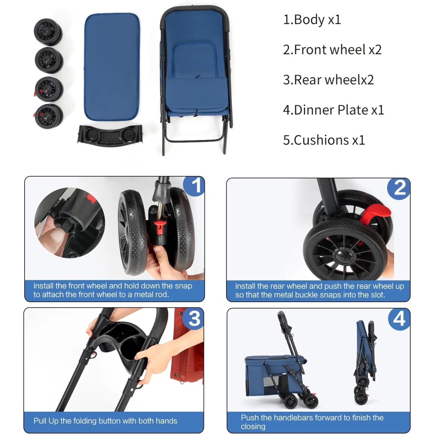 Fácil de plegar para almacenamiento: el cochecito para mascotas se puede plegar tirando de las hebillas en ambos lados.Fácil de transportar y almacenar.El compartimento de almacenamiento también puede transportar agua potable y comida para mascotas.