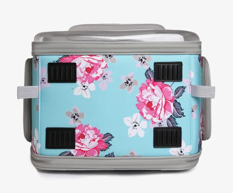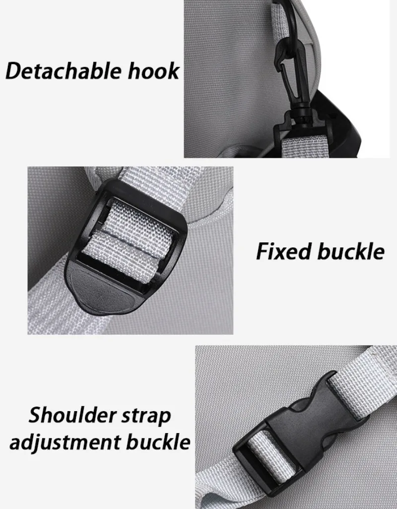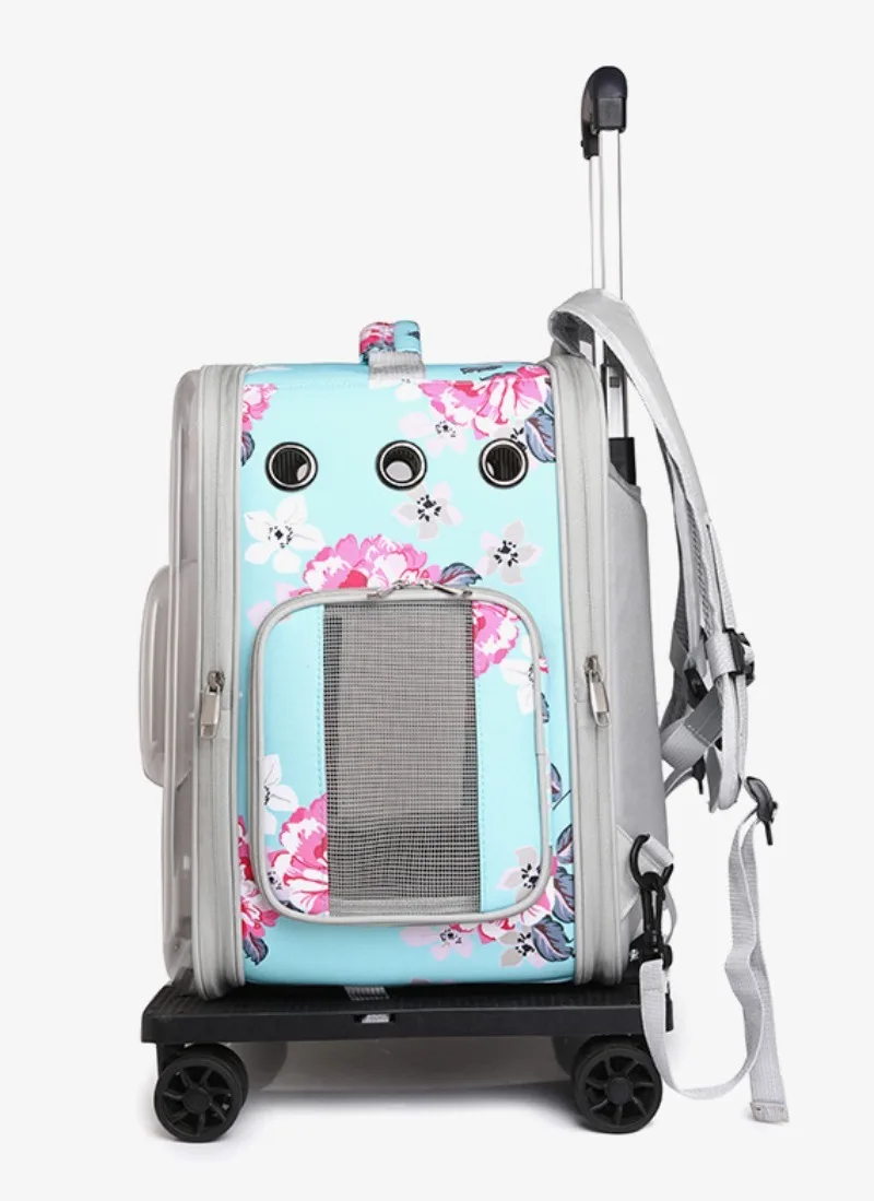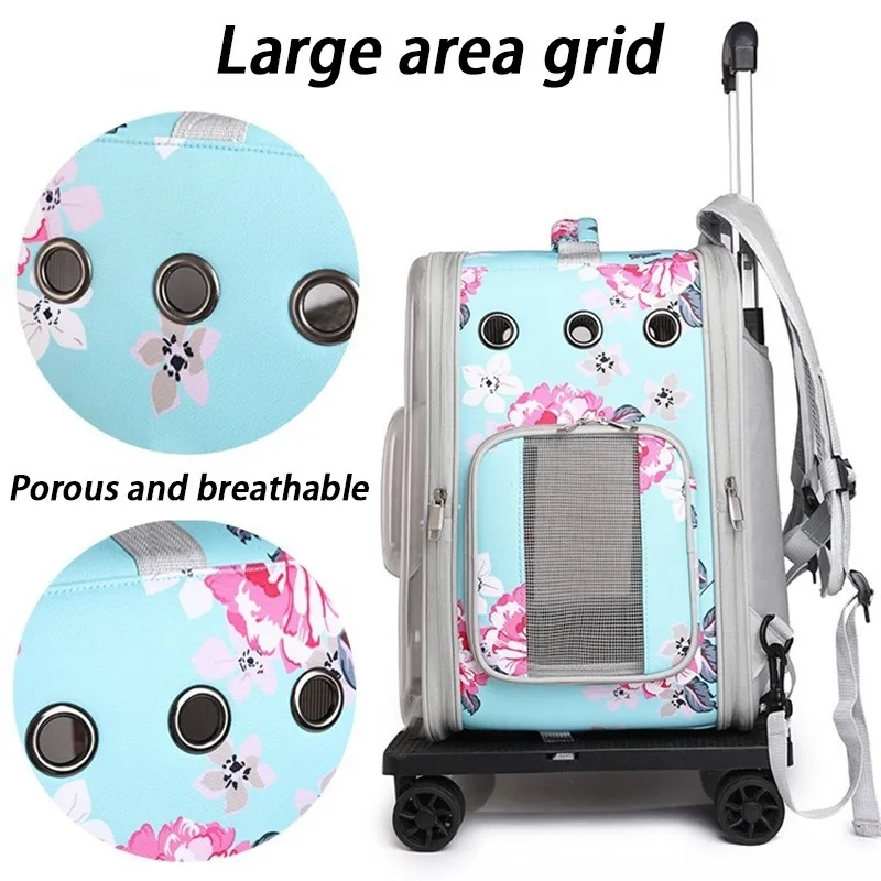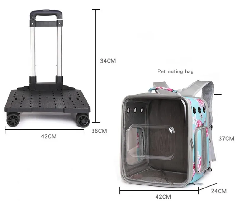 Material: poliéster Tamaño: 42X24X27CM Paquete inferior fijo, velcro fijo. 360° Rueda universal giratoria. Rejilla de gran superficie, porosa y transpirable por ambos lados. Apertura lateral, fácil acceso. Cuerda anticanalización incorporada. Cremallera sencilla. Gancho extraíble, puede cambiar libremente la forma de transporte. Hebilla fija, puede fijar la hebilla del pecho. Hebilla de ajuste de la correa para el hombro, puede ajustar libremente la longitud.