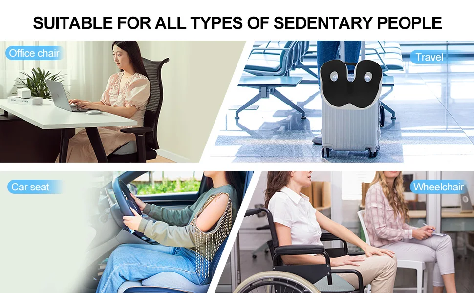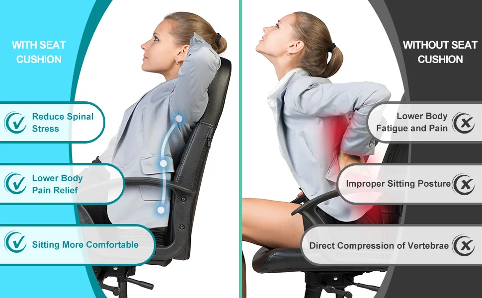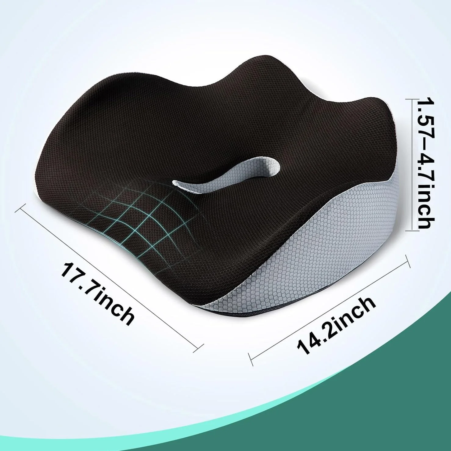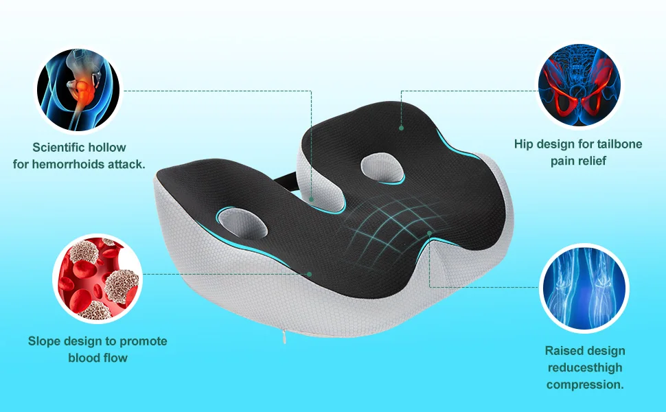 Comodidad: este cojín para silla está diseñado ergonómicamente para aliviar las molestias de una oficina sedentaria, se adapta a la curva de las nalgas humanas, envuelve el coxis, reduce la presión sobre las nalgas, promueve la circulación sanguínea y está científicamente ahuecado para relajar uniformemente la presión sobre las nalgas y el coxis.Proporciona comodidad y apoyo óptimos.