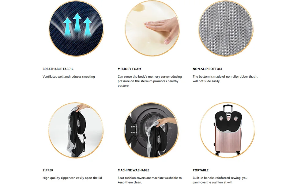 Transpirable y fácil de limpiar: la capa exterior del cojín está hecha de tela de malla transpirable, que evita la acumulación de calor y mejora la comodidad.La funda extraíble se puede lavar a mano o a máquina, y la parte inferior de goma antideslizante garantiza una posición óptima del asiento y evita el deslizamiento para mayor seguridad.