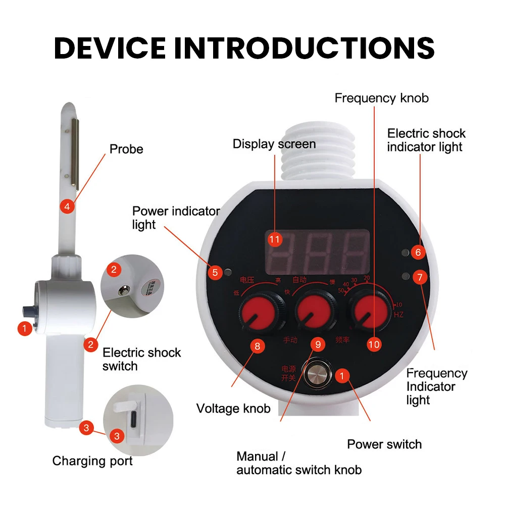 7.Presione el interruptor de descarga eléctrica para iniciar la estimulación de descarga eléctrica.Presione durante 1 segundo para pausar durante 1 segundo para funcionamiento intermitente.Al mismo tiempo, observe si el animal tiembla con el ritmo del botón.Si al principio no hay respuesta, puede girarla en algunos ángulos para estimular o probar la estimulación en profundidad.Si no hay respuesta o la respuesta es débil, puede aumentar el voltaje en 1V e intentar nuevamente.Si aún no hay respuesta, gire la perilla derecha hacia la izquierda.Una marcha, observe y ajústela repetidamente hasta que haya respuesta.