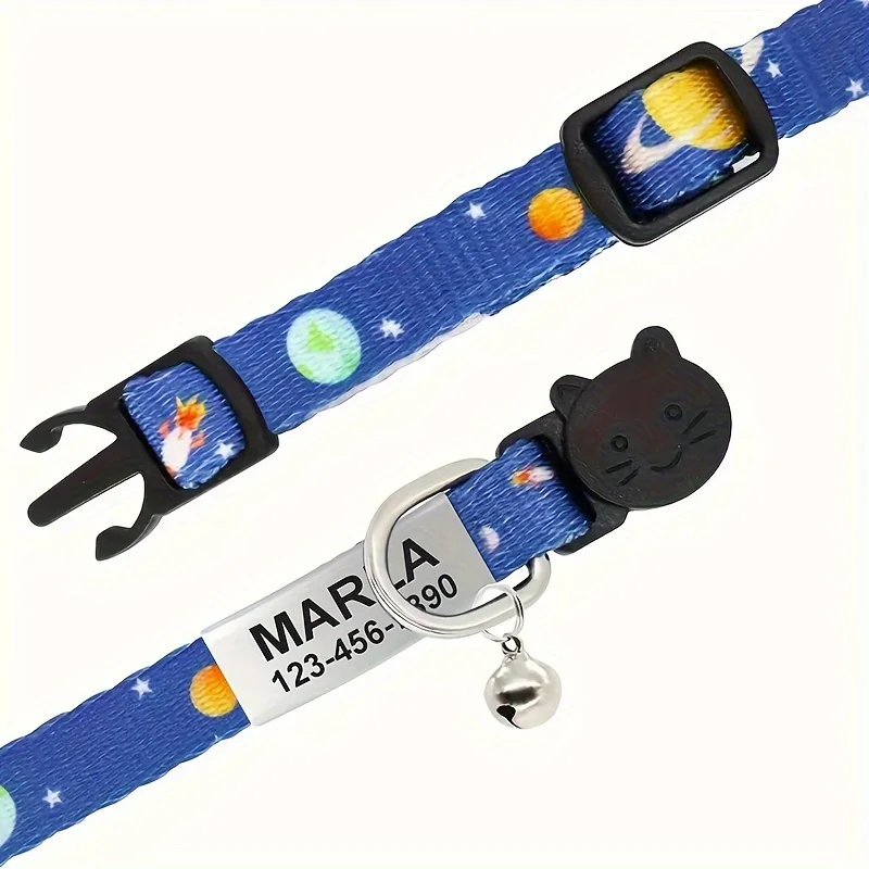 Collar de seguridad con diseño de planeta espacial ajustable personalizado, hebilla de nailon para gatos, perros pequeños, etiqueta de identificación grabada, nombre, dirección de teléfono