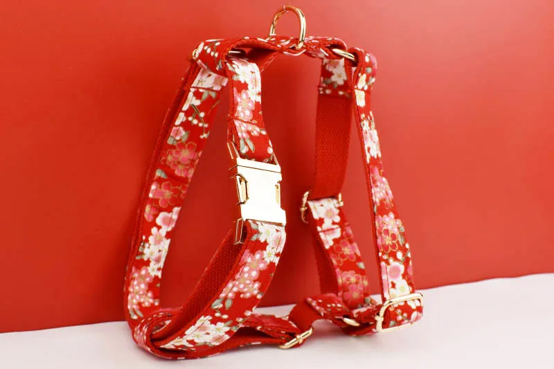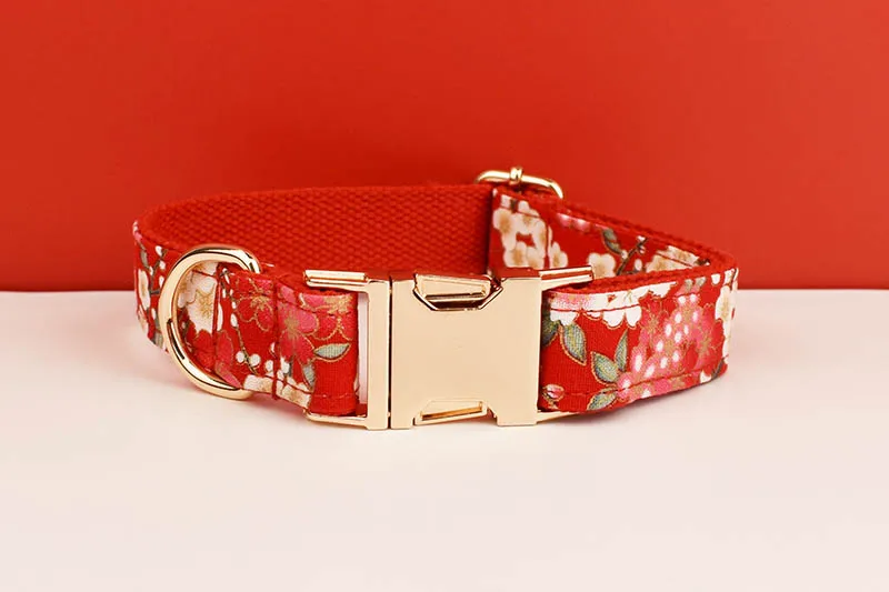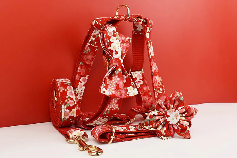 Diseñador personalizado de alta calidad, algodón suave rojo, accesorios personalizados para mascotas, Collar de perro, correas, arnés, conjunto de lazo Cotton02