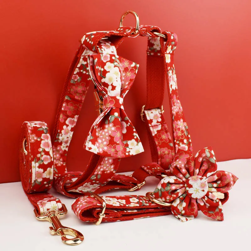 Diseñador personalizado de alta calidad, algodón suave rojo, accesorios personalizados para mascotas, Collar de perro, correas, arnés, conjunto de lazo Cotton02