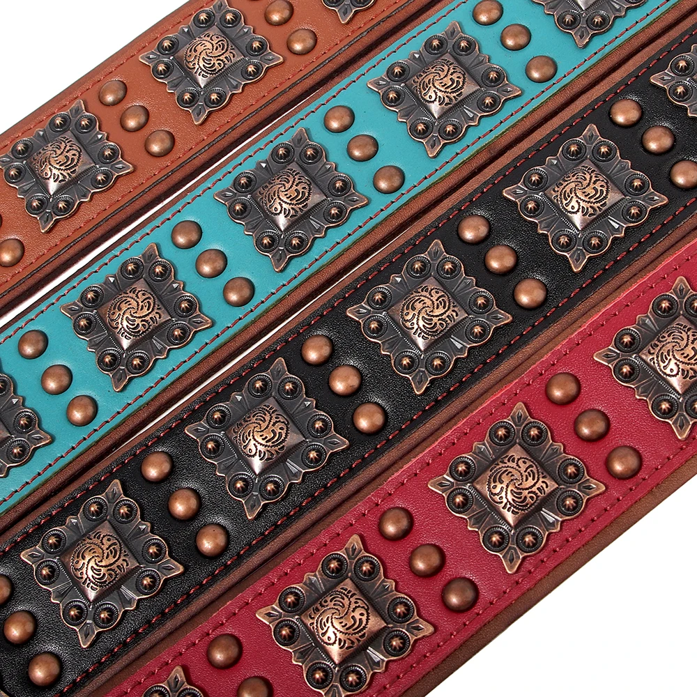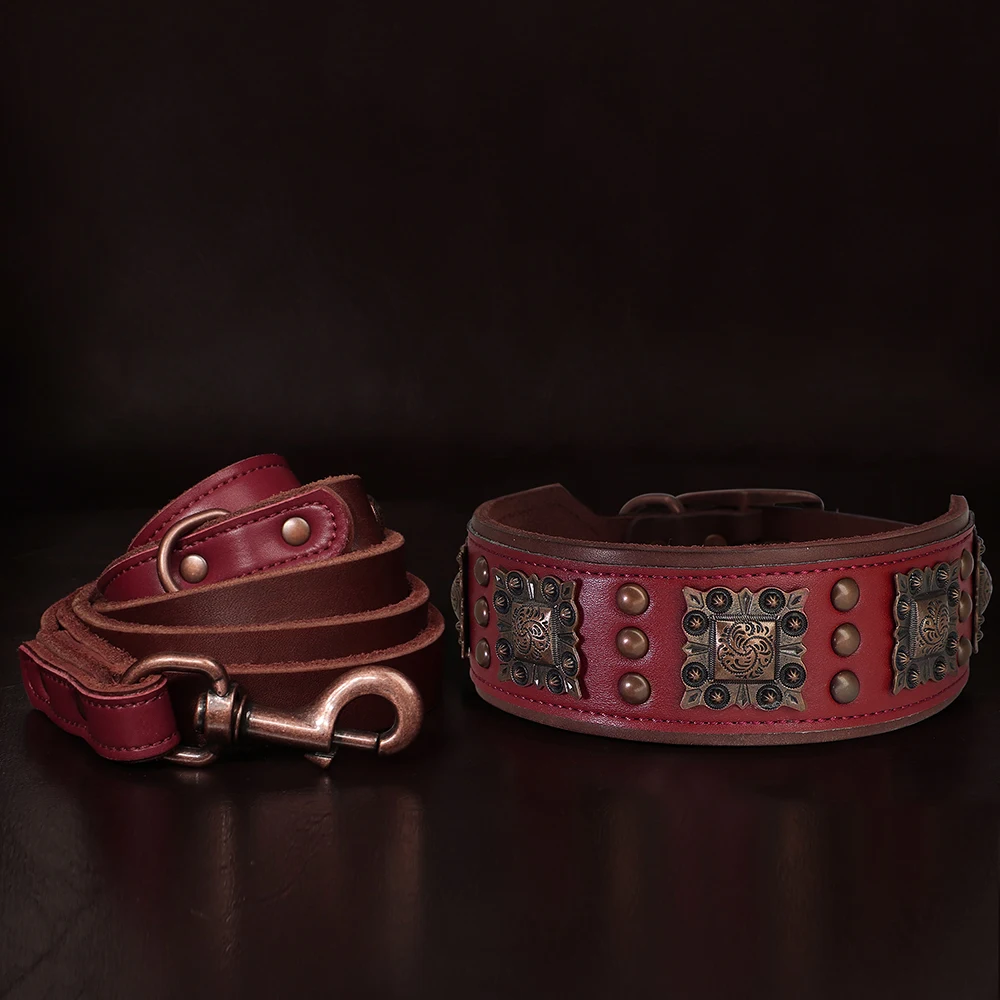 Collar ancho de cuero genuino para perro, conjunto de correa, collares acolchados duraderos para perro, collar de lujo con remaches de Metal para mascota con cuerda para perros Pitbull