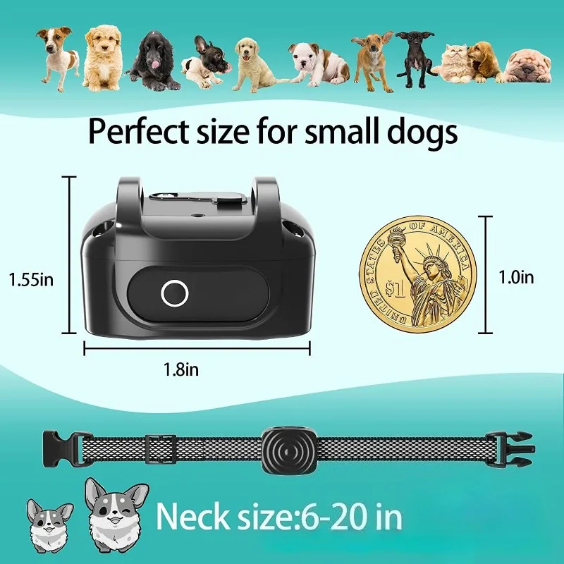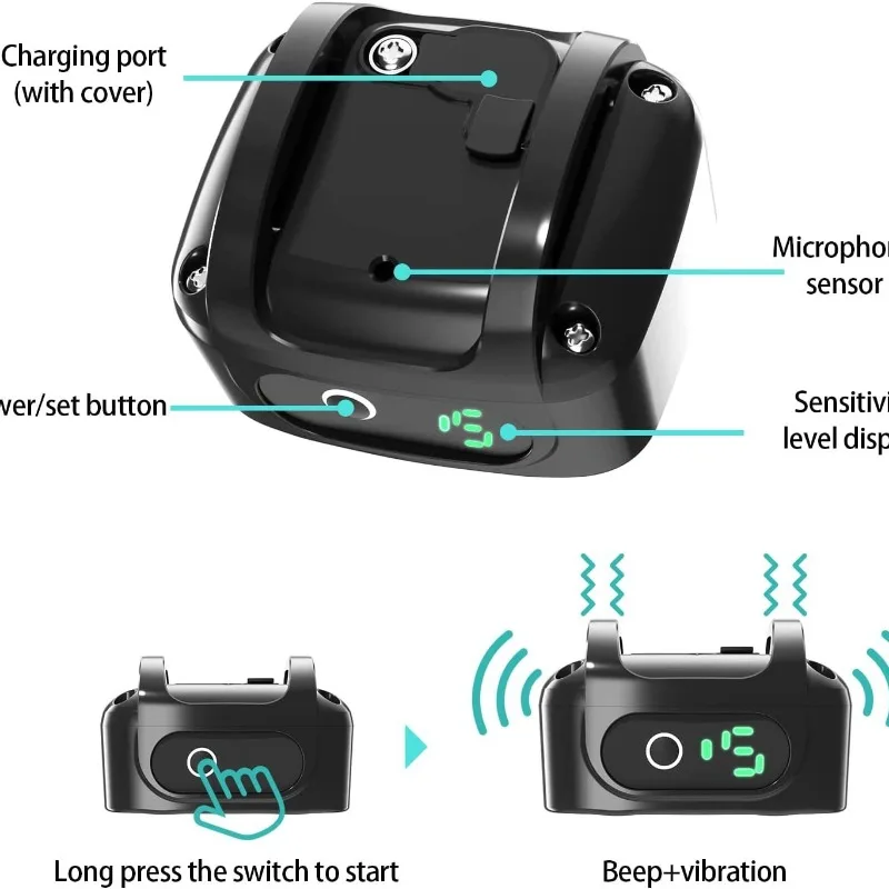 Información del producto Nombre del producto: tapón para ladridos de mascotas (vibración) Material: ABS Descripción de la función 1.Sonido, vibración 2.Duración de la batería de carga IP67 resistente al agua 3.Sensibilidad de detección ajustable (5 velocidades ajustables) 4.Luz de visualización de la batería 5.Modo de suspensión automático de seguridad inteligente 6. Actualice el sistema de reconocimiento de voz del perro inteligente