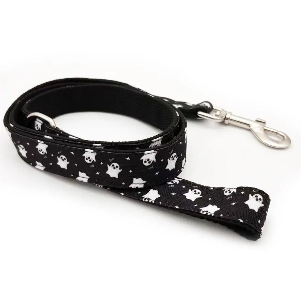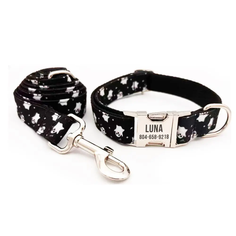Nombre del producto: Collar de contacto con nombre de mascota personalizado, accesorio para perro con patrón de Halloween, suministro para mascotas, collares para perros fantasma lindos ajustables