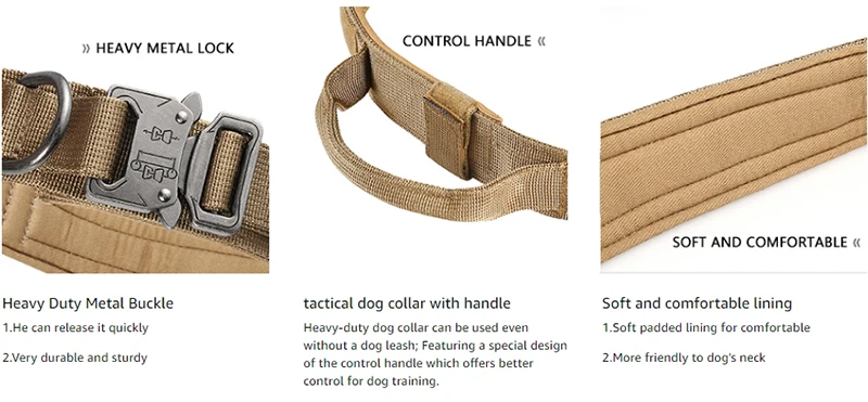 3. Con manija de control, anillo en D para correa de perro y superficie de velcro para colocar parches.Con el asa es fácil quitarle el collar de su perro cuando lo coloca en la correa.