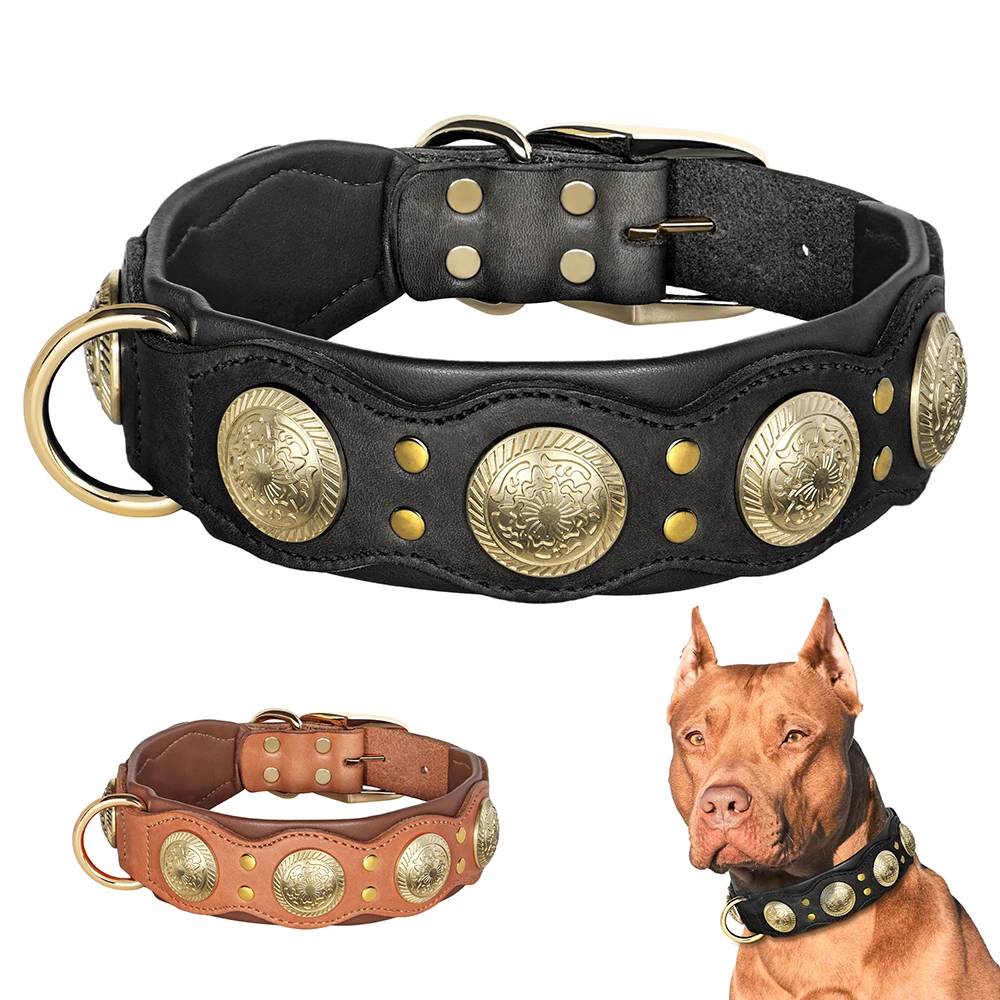 Collar de perro de cuero duradero, collares con tachuelas geniales para perros medianos y grandes, Collar de Mascota de cuero genuino Pitbull Bulldog marrón