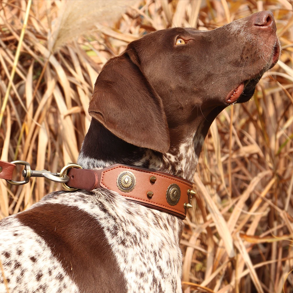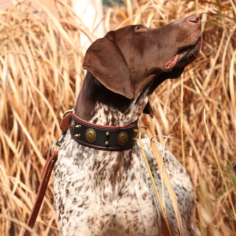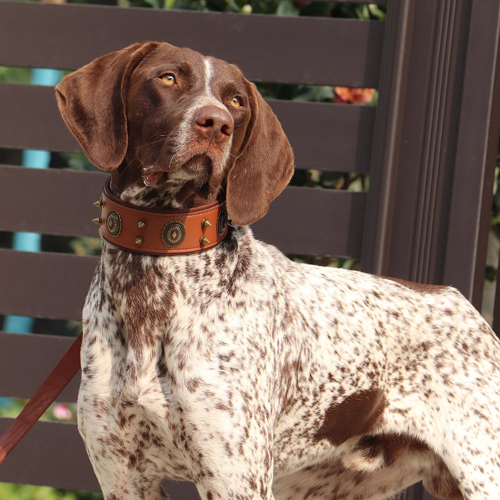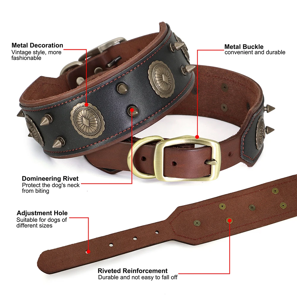 Super Cool Pet Dog Collar de cuero genuino con tachuelas Collares ajustable Big Dog Collar para perros medianos y grandes Pitbull Correa