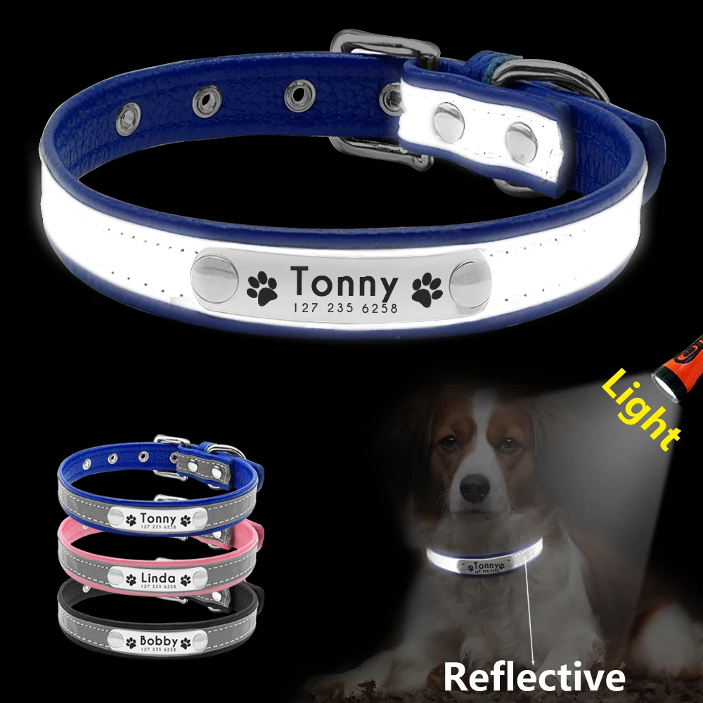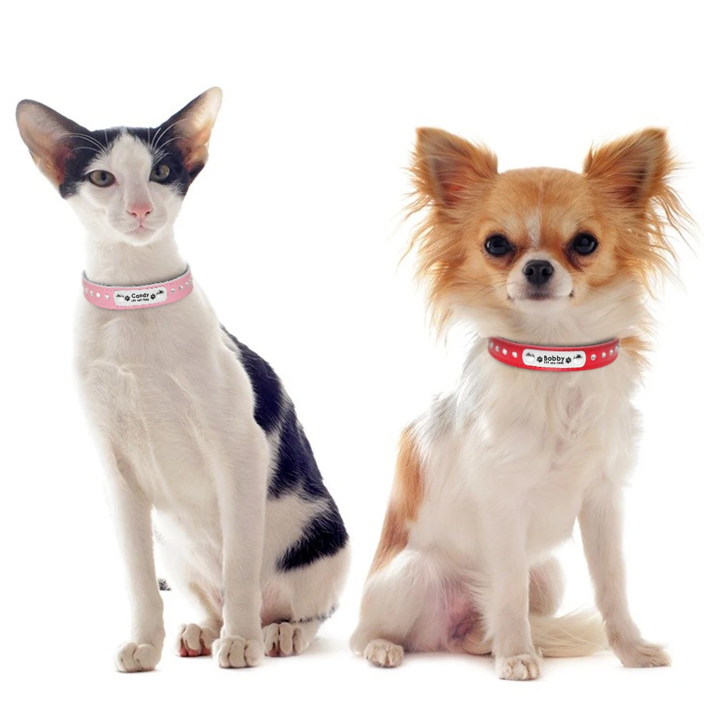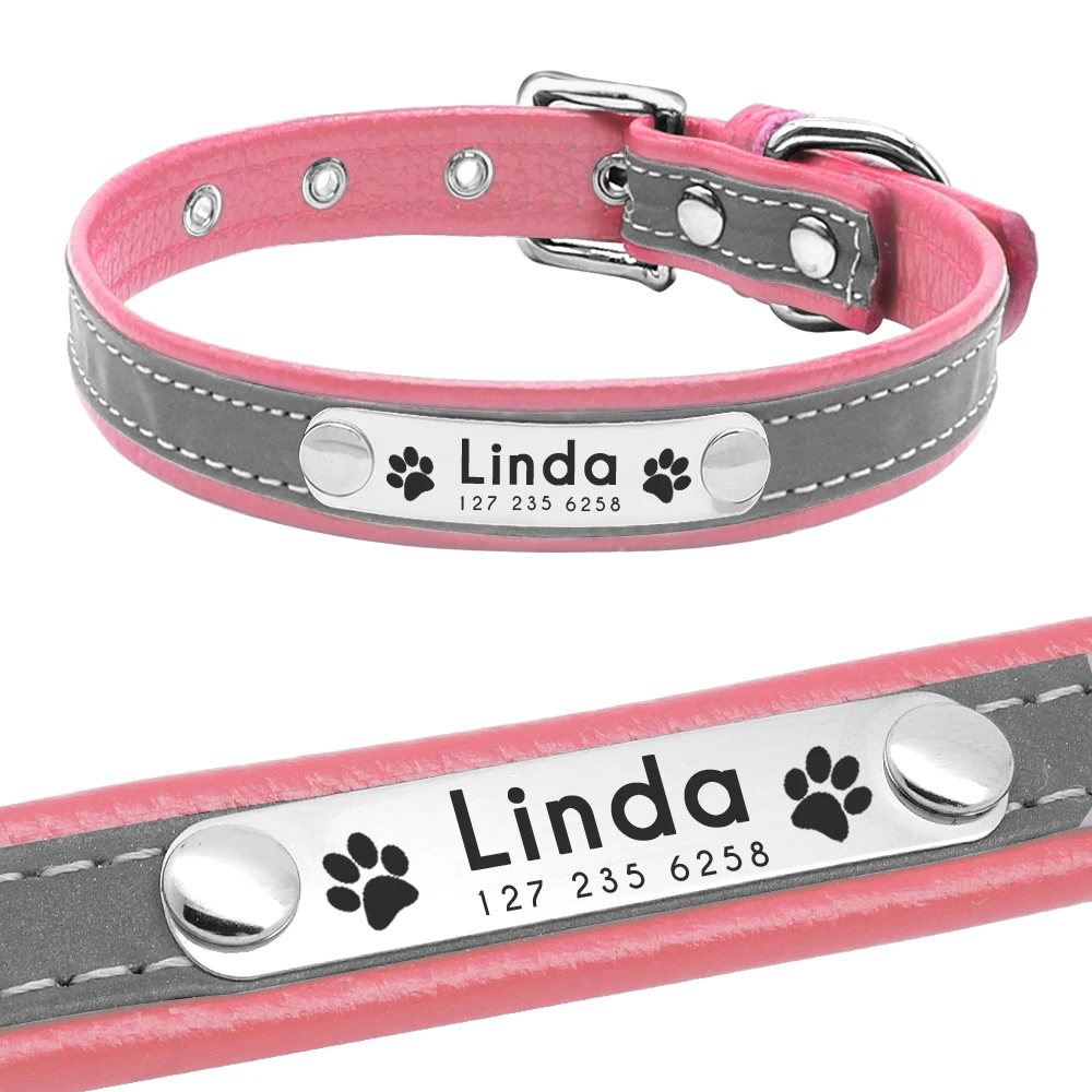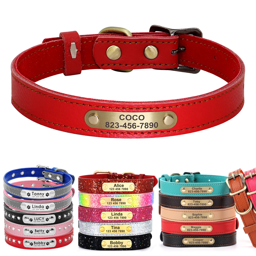 Nombre: Collar de cuero personalizado para perro, gato, Pug, perro, ID, etiqueta de nombre, collares, grabado gratis, perros pequeños, gatos, placa de identificación, Collar
