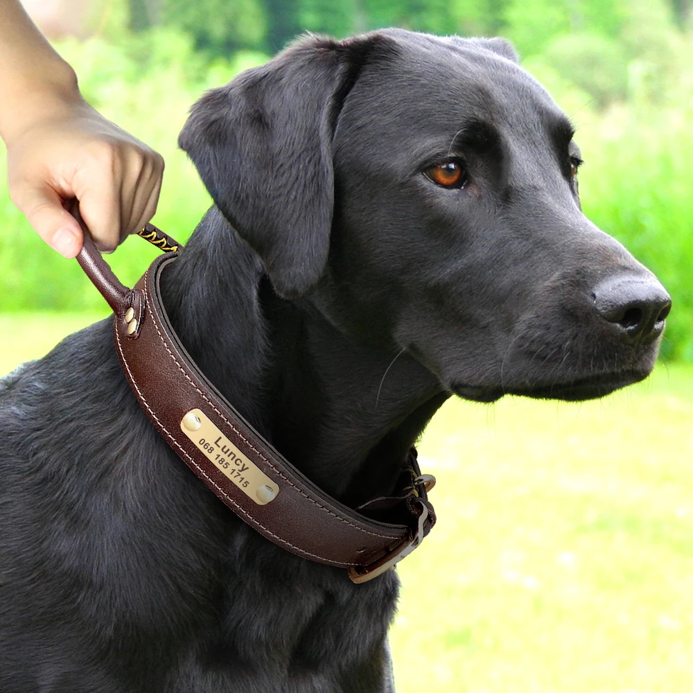 Collar de cuero personalizado para perros, Collar de identificación personalizado para mascotas con mango, Collar con placa con nombre grabada, ajustable para perros medianos y grandes