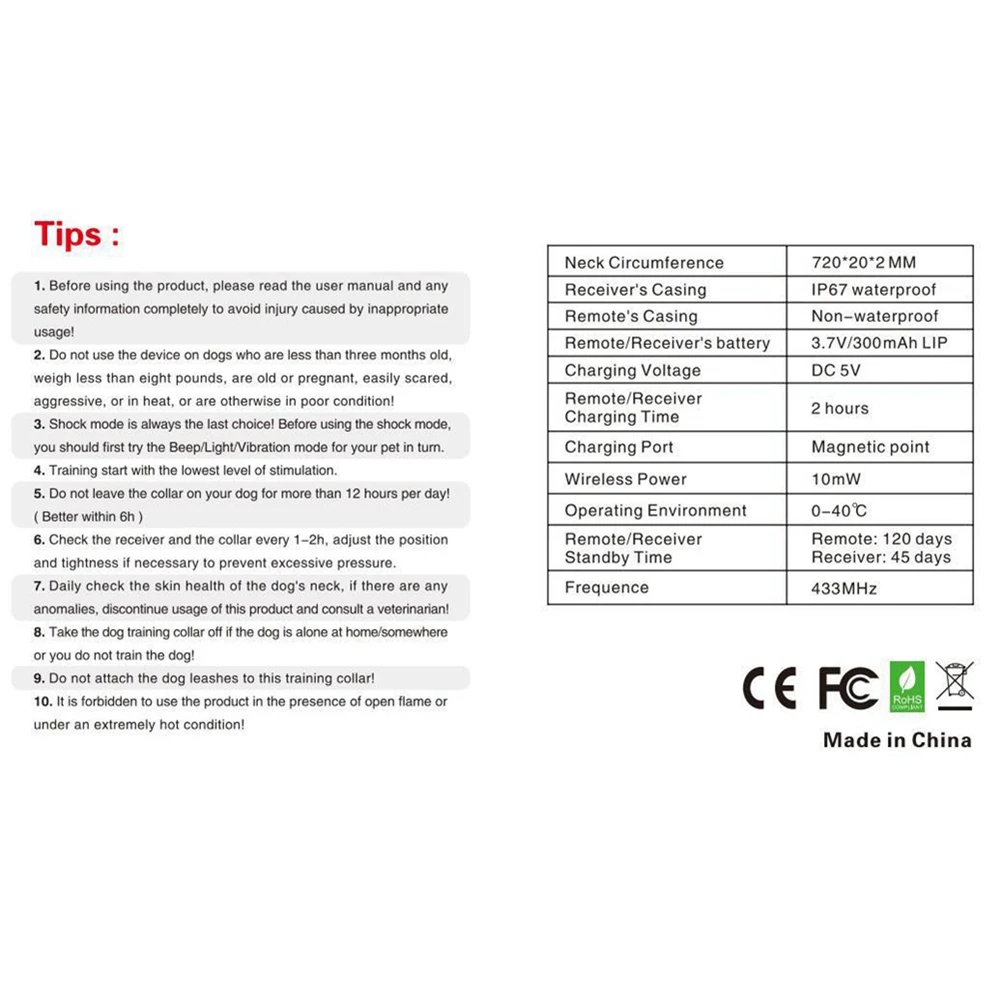 ¡PRECAUCIÓN! El ajuste adecuado del collar es importante. Un collar usado durante demasiado tiempo o demasiado apretado en el cuello de la mascota puede causar daños en la piel. Estos collares pueden causar necrosis por presión si se usan incorrectamente y a menudo se identifican erróneamente como quemaduras.