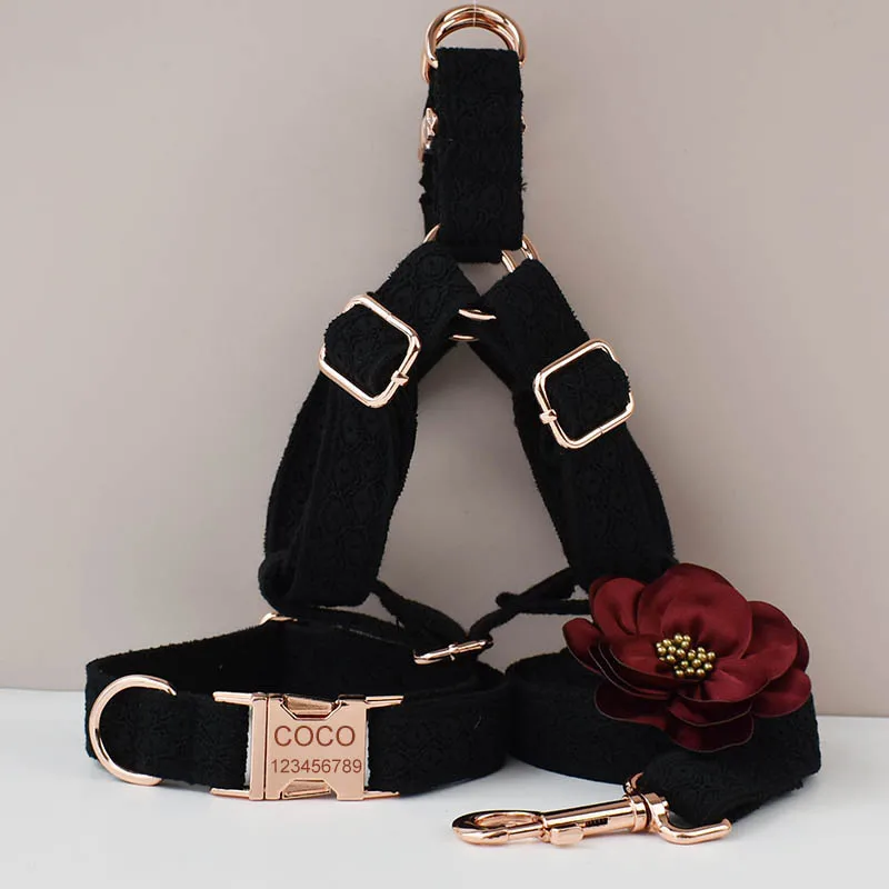 Collar de encaje negro con grabado gratis para perro, conjunto de correa para mascota mediana y grande, accesorios de boda para perro femenino
