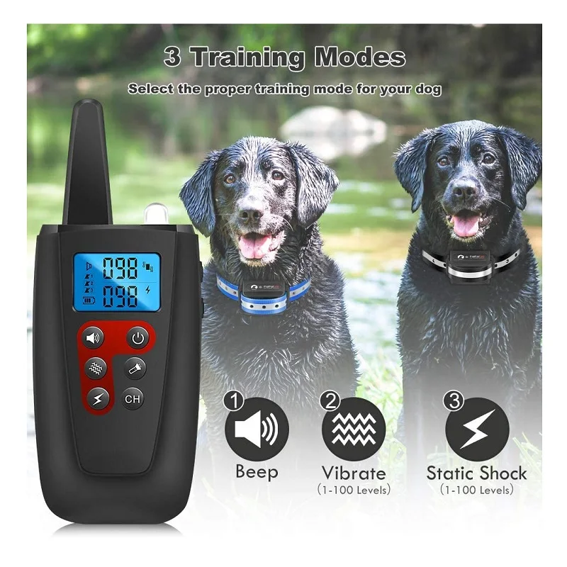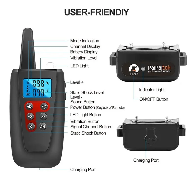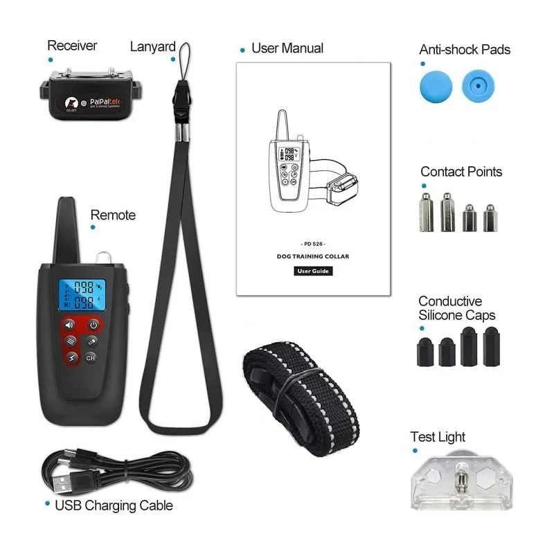 Modelo PD 526-TIO-1 Recargable SI Alcance remoto 1000M Función Pitido + Vibración + Descarga Estética + Luz LED Modo Modo antiladridos + Modo de entrenamiento remoto para perros Sensibilidad ajustable 100 niveles Collar Collar de nailon reflectante negro ajustable Composición de la batería Polímero de litio Certificación del producto CE, ROHS, FCC OEM Aceptar