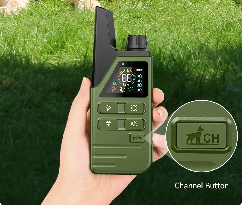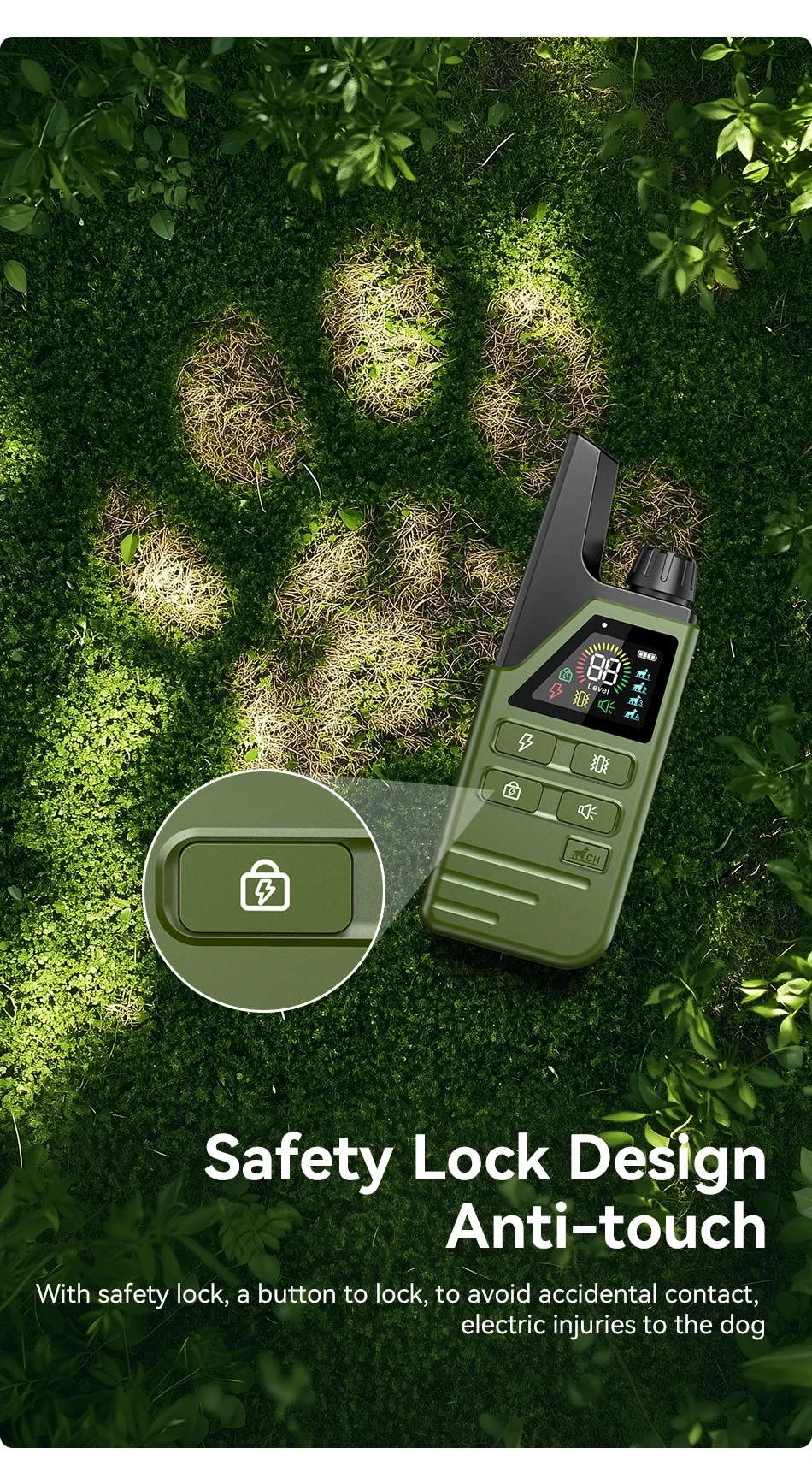El diseño exclusivo del control remoto presenta 115 niveles de entrenamiento: pitido, vibración (1-15) y descarga eléctrica de seguridad (1-99) para entrenar eficazmente a su perro y detener su mal comportamiento.