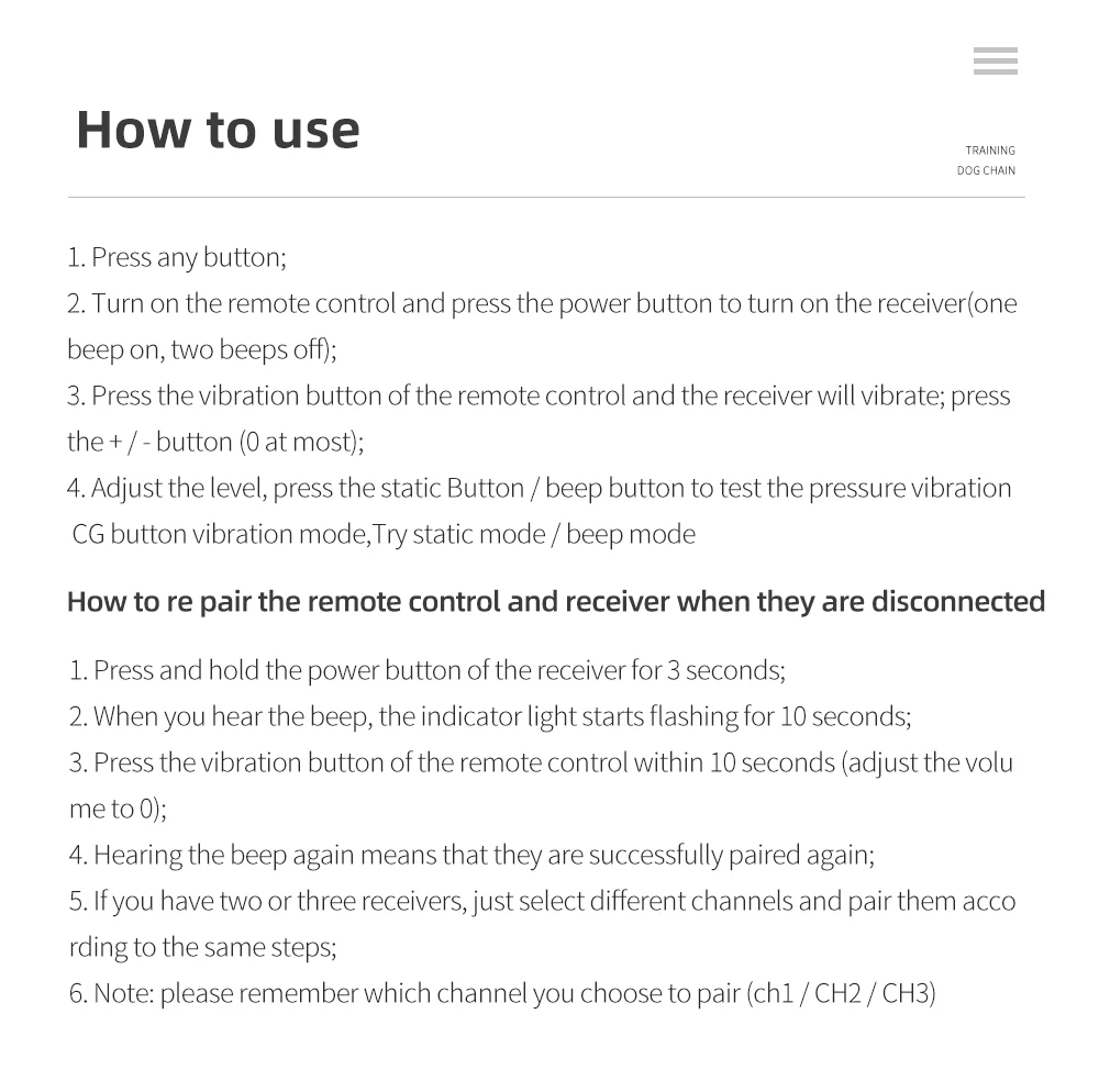 Contenido del paquete: 1 x transmisor, 1 x collar receptor, 1 x luz de prueba, 1 x correa de collar ajustable, 1 x cable cargador, 1 x enchufe, 2 x electrodo de choque, 1 x manual de usuario en inglés