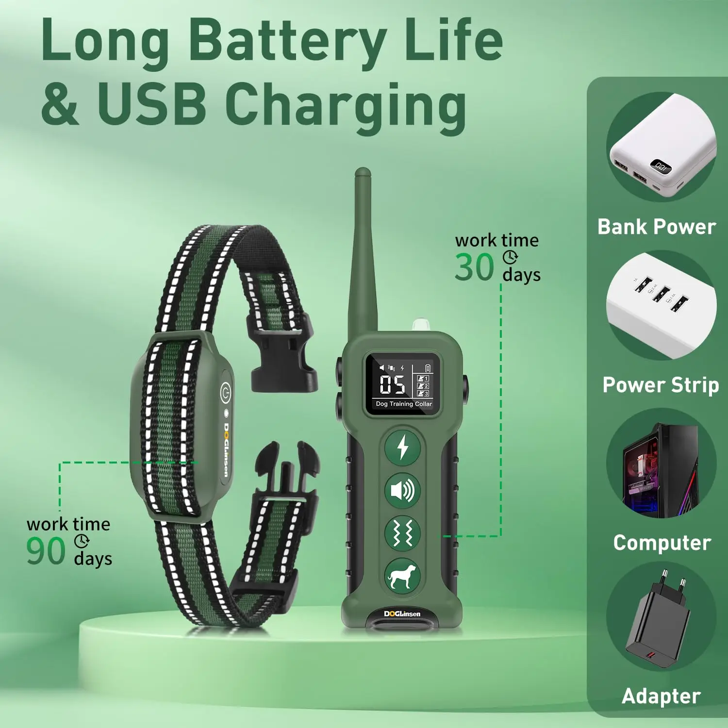 【Carga rápida y batería de larga duración】 Nuestro collar de choque para adiestramiento de perros con control remoto que contiene una batería de iones de litio de 650 mAh líder en la industria, proporciona 60 días de duración extrema de la batería. Cable de carga USB-C 2 en 1, carga rápida 2 horas