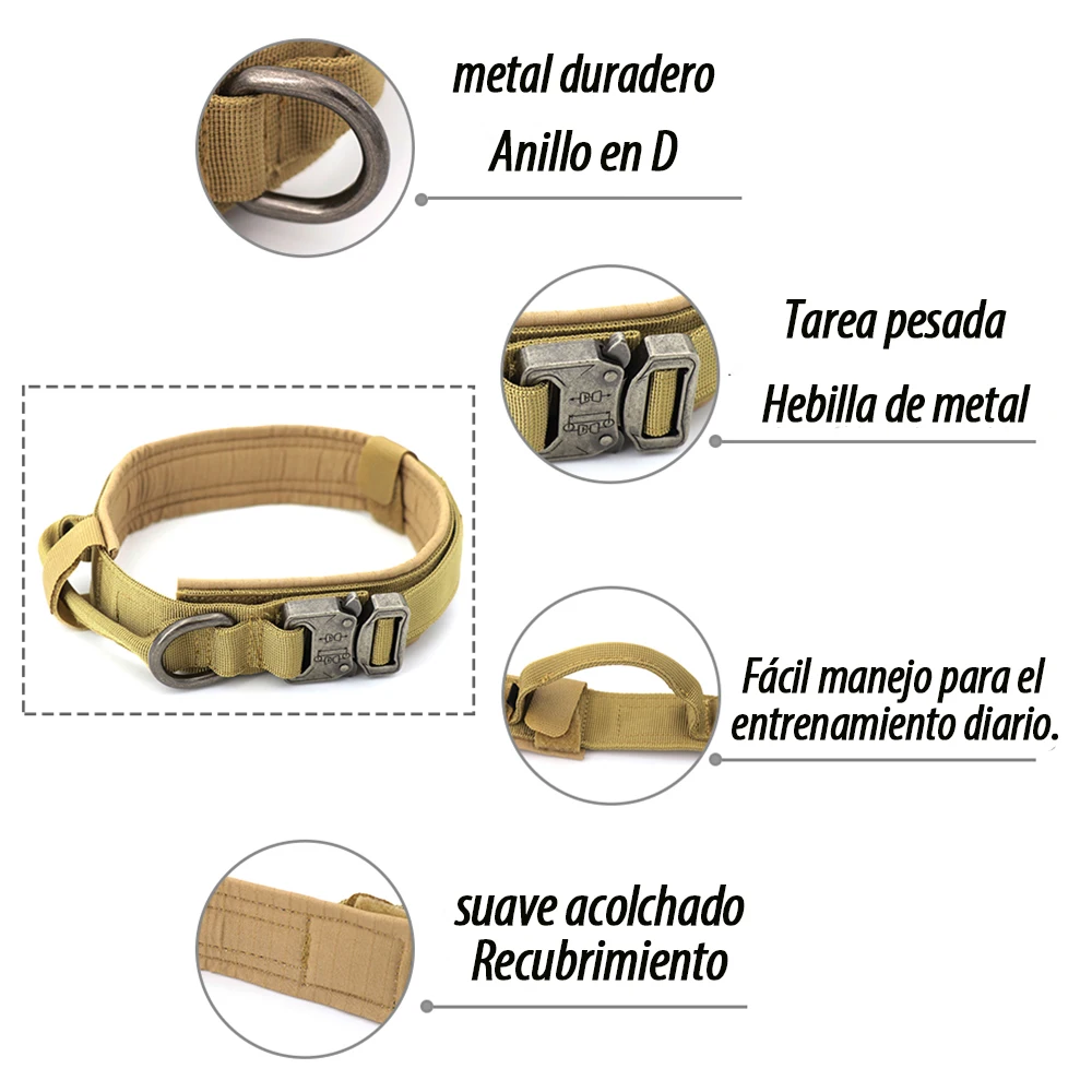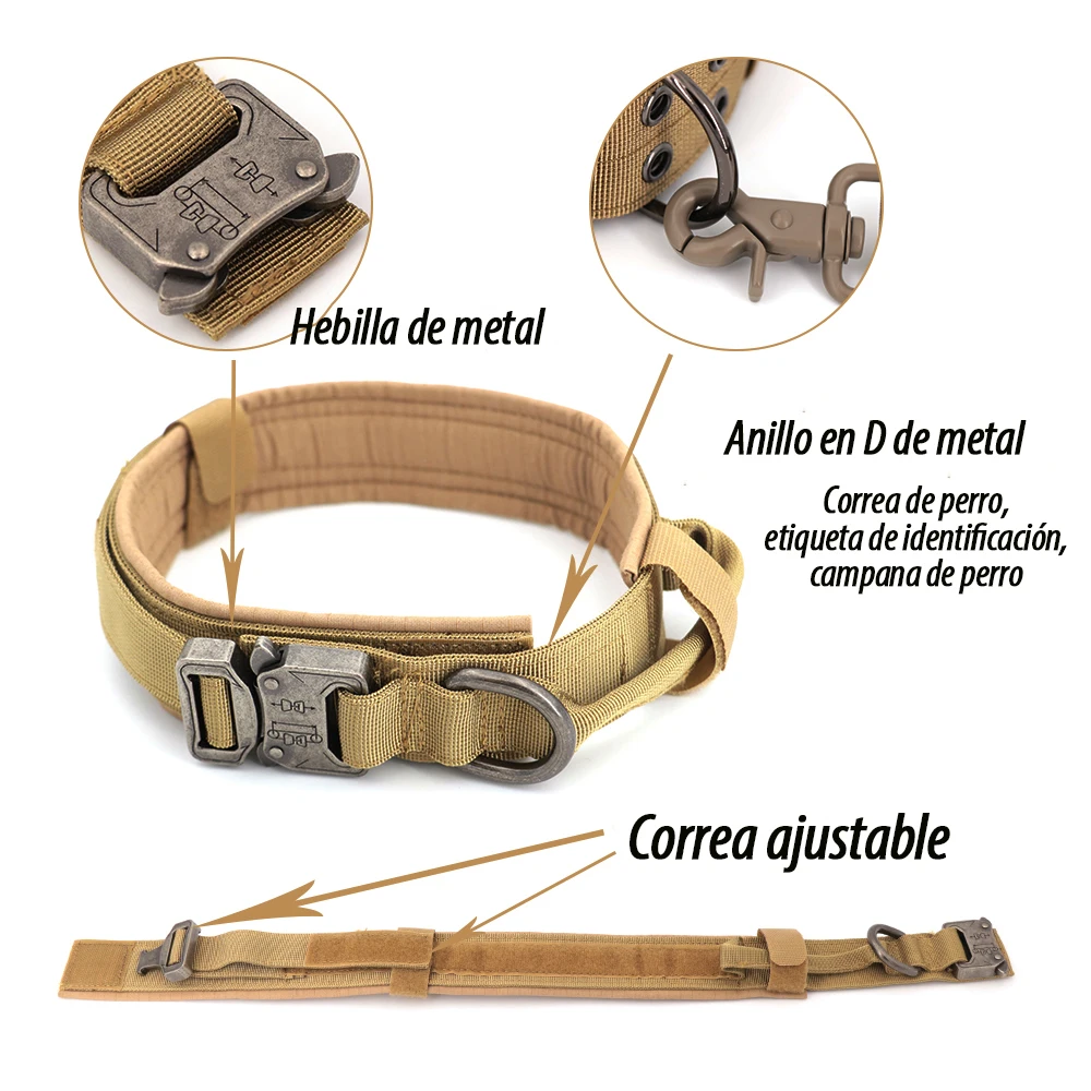 Pegatina mágica y cierre doble de hebilla de liberación rápida. La hebilla de metal de liberación rápida es resistente y fácil de poner y quitar. El collar táctico para perros se cierra primero con una pegatina mágica, luego puedes bloquear la hebilla para que haya una doble capa de protección para que tu perro no pueda rasgarlo.