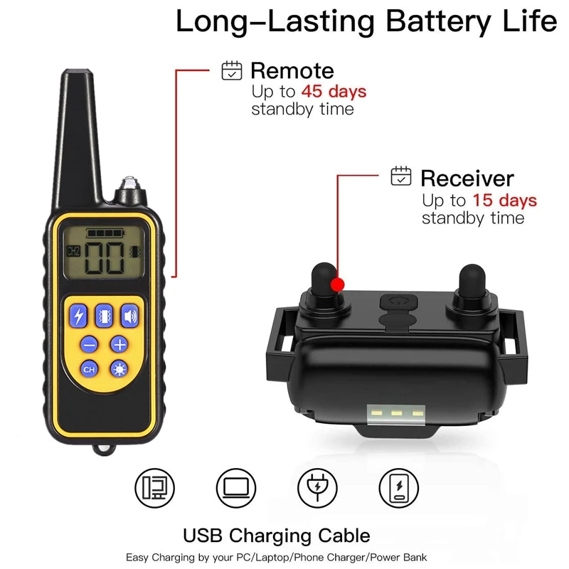 ④.Super long life and rechargeable battery: The remote control and receiver can be recharged, and the universal USB charging cable included in the package can be charged at the same time. After 2 hours of full charge, the collar can work for 15-20 days