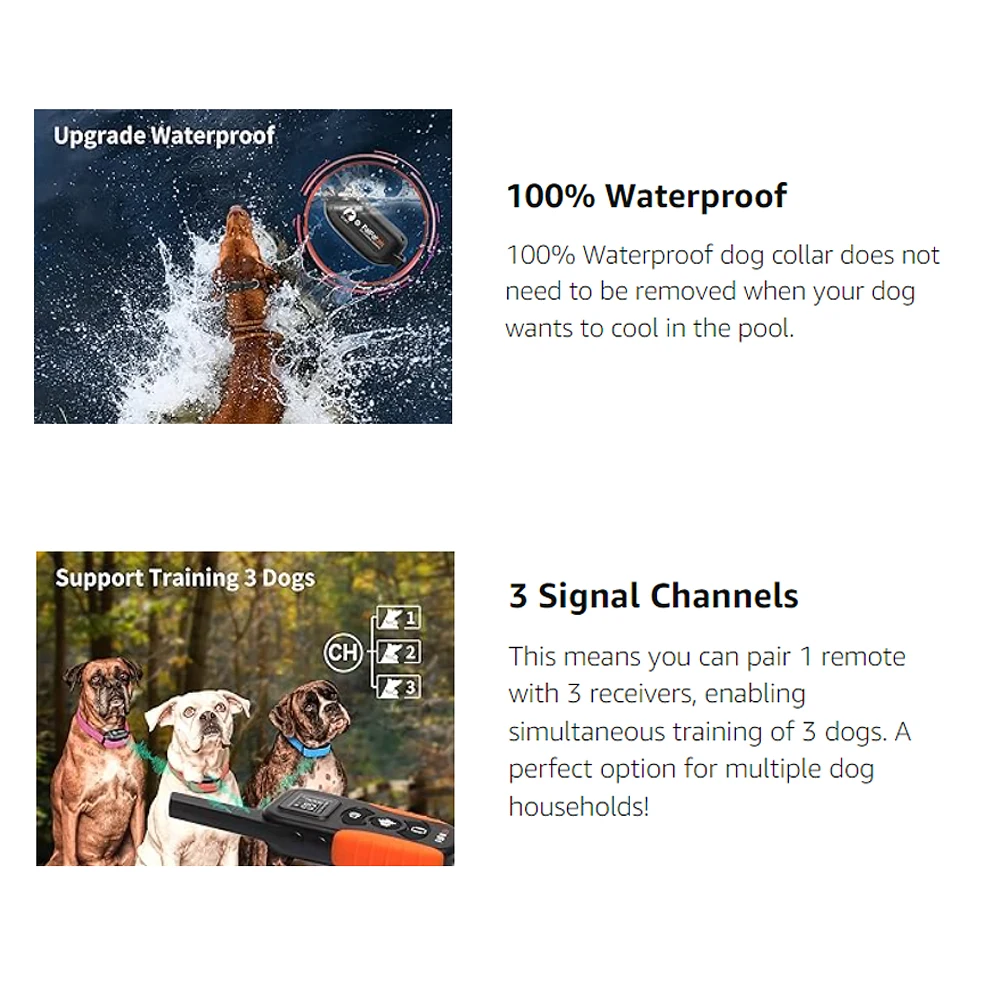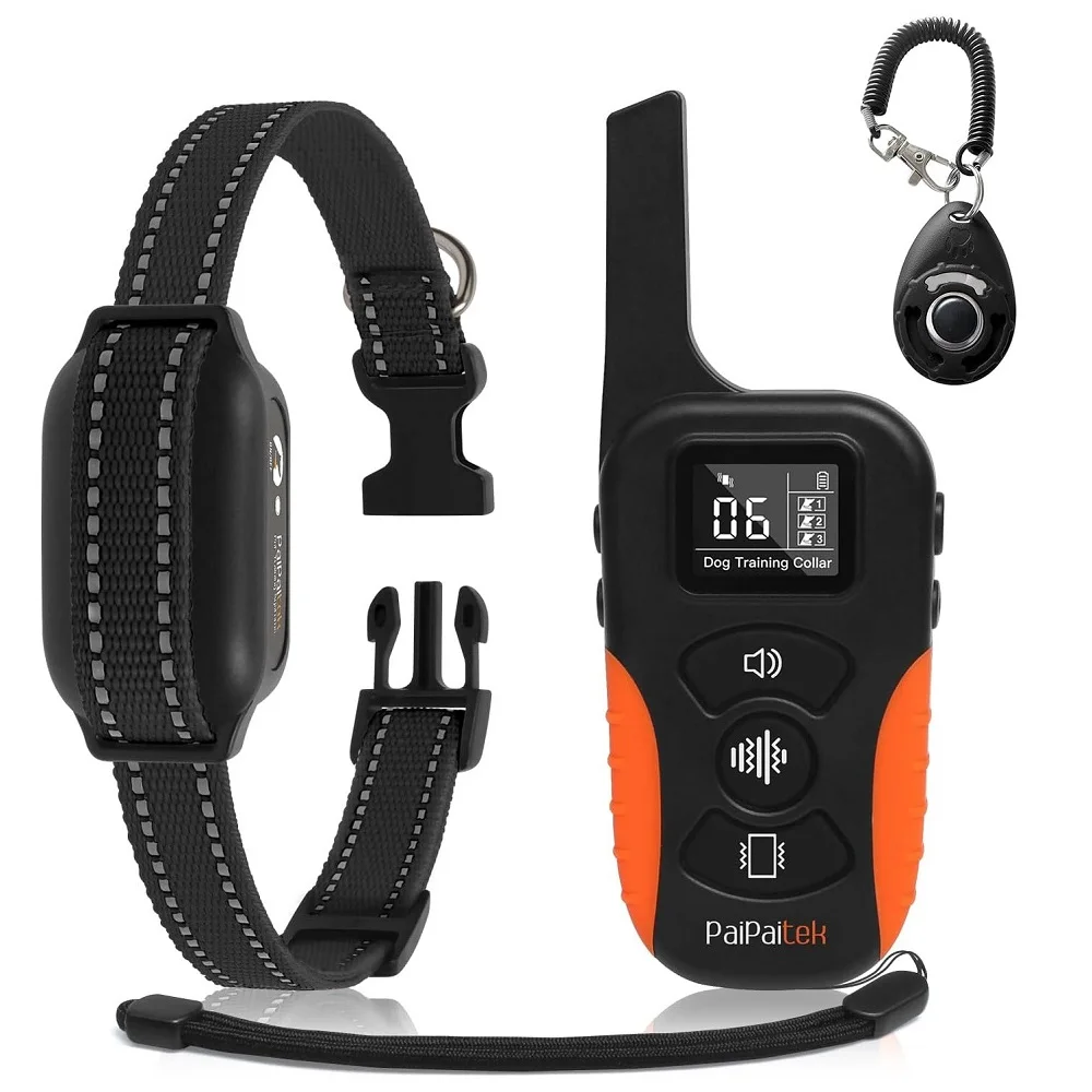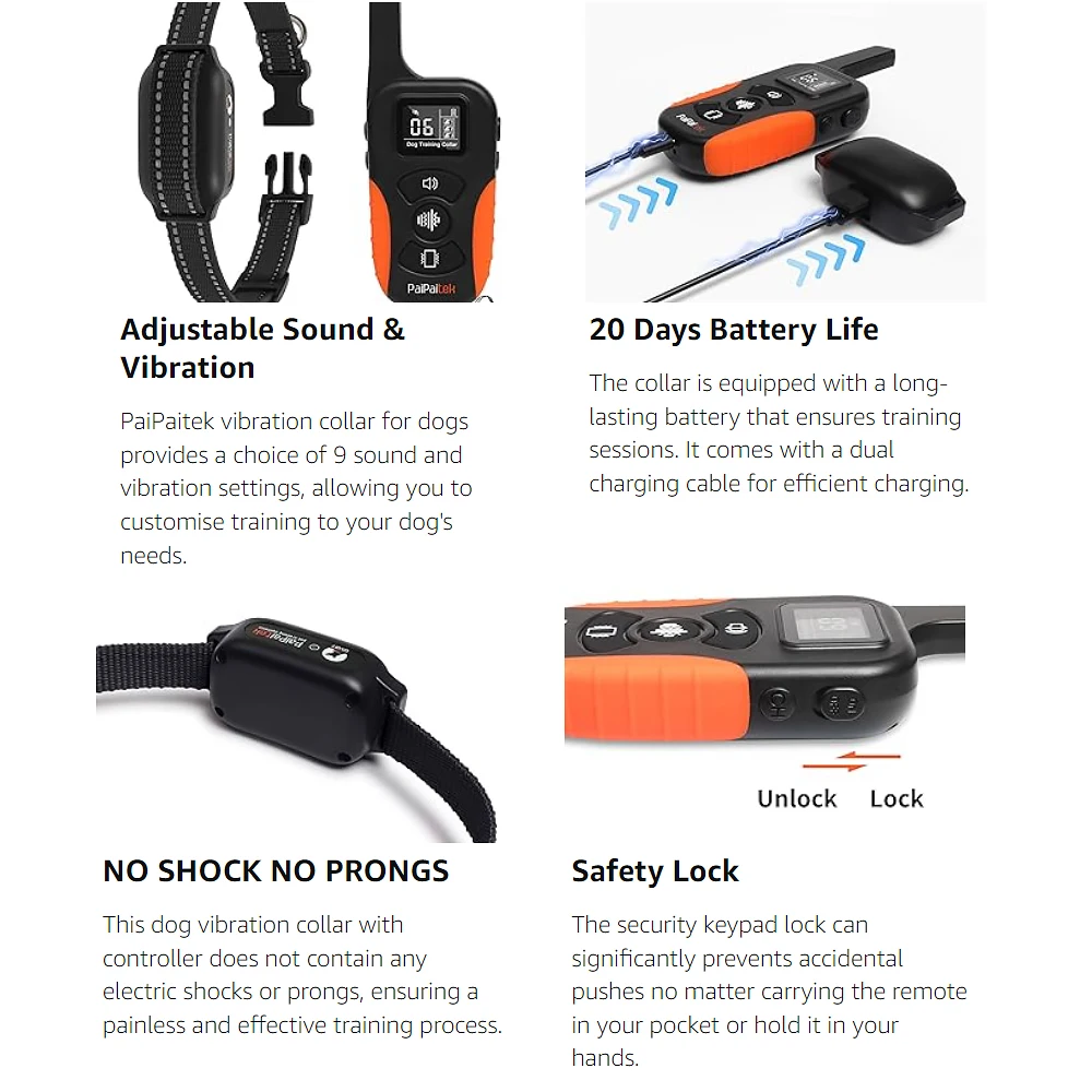 Conjunto genial para entrenamiento de perros. El conjunto incluye un collar vibrador, control remoto, cable de carga, llavero y manual de usuario. Collar - negro, impermeable, longitud - 71 cm, ajustable para tu perro y se puede recortar. Llegó ya cargado y funciona a la perfección. A través del control remoto, puedes enviar señales al collar en 9 tipos, vibración en 9 tipos, o una combinación de vibración y señal en 9 tipos. Funciona perfectamente, sin descarga eléctrica, solo vibración. Funciona a una distancia de 1000 metros. Cargado una vez y ha estado funcionando durante casi un mes. Muy buena calidad, se ve de alta gama. Entrega en 7 días a Italia. ¡Lo recomiendo!