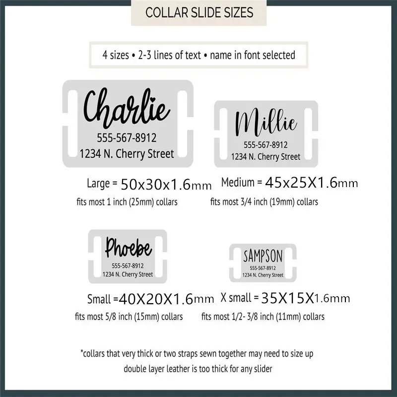 Tamaño exacto para los collares de mis gatos. Buena calidad del material y grabado, está ligeramente redondeado para que no moleste al colocarlo en los collares, tampoco se cae fácilmente 100% recomendado.