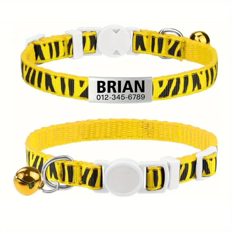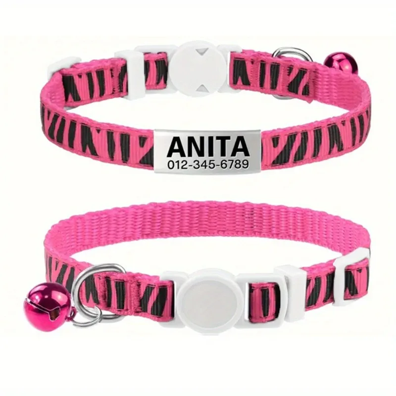 Collar personalizado con estampado de cebra para gatos, collar con placa con identificación de mascota, gatito y cachorro grabado gratis con campana, antipérdida para gatos