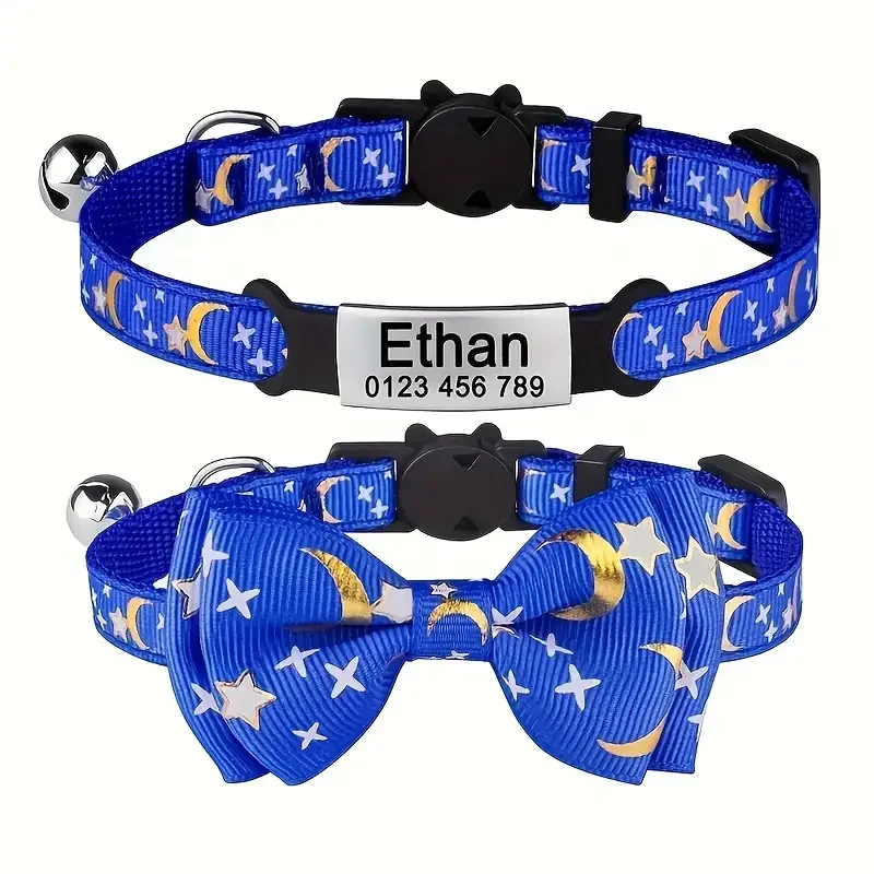 Nombre de mascota grabado personalizado y número de teléfono Etiqueta de identificación de gato Collar de gato con estampado de luna y estrella con lazo Adecuado para gatos de mascota
