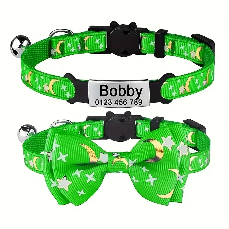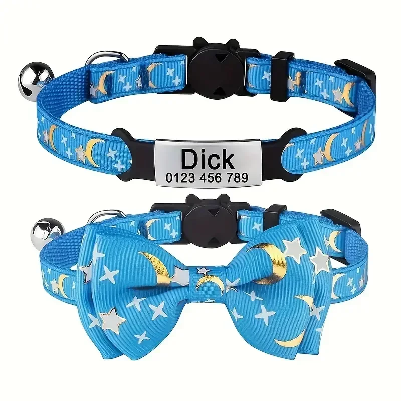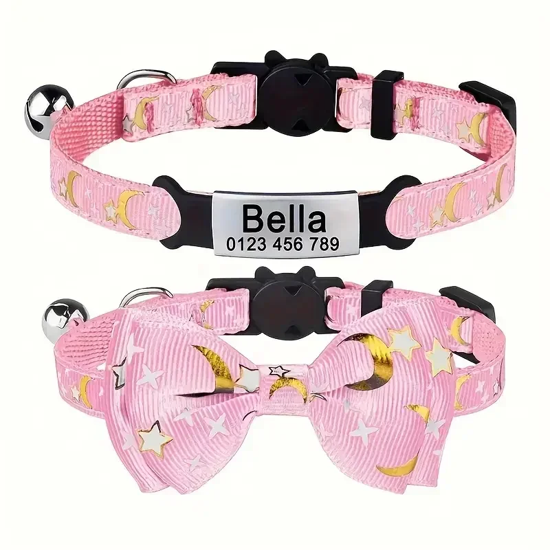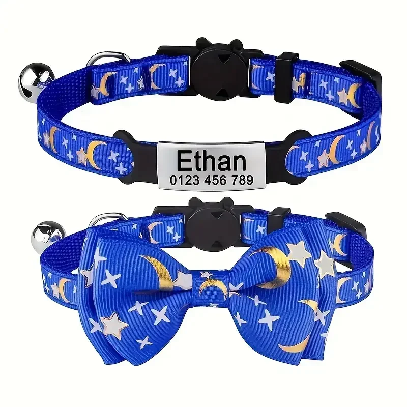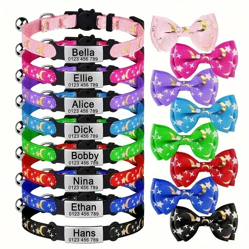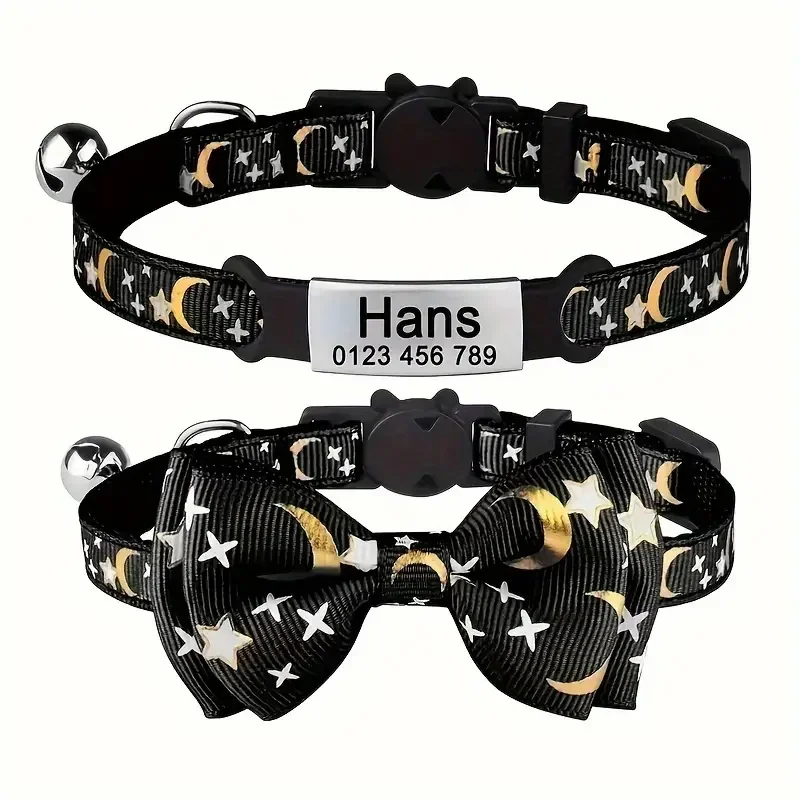 Collar de gato con estampado de luna y estrella, nombre de mascota grabado personalizado y número de teléfono, etiqueta de identificación de gato con lazo, adecuado para gatos domésticos