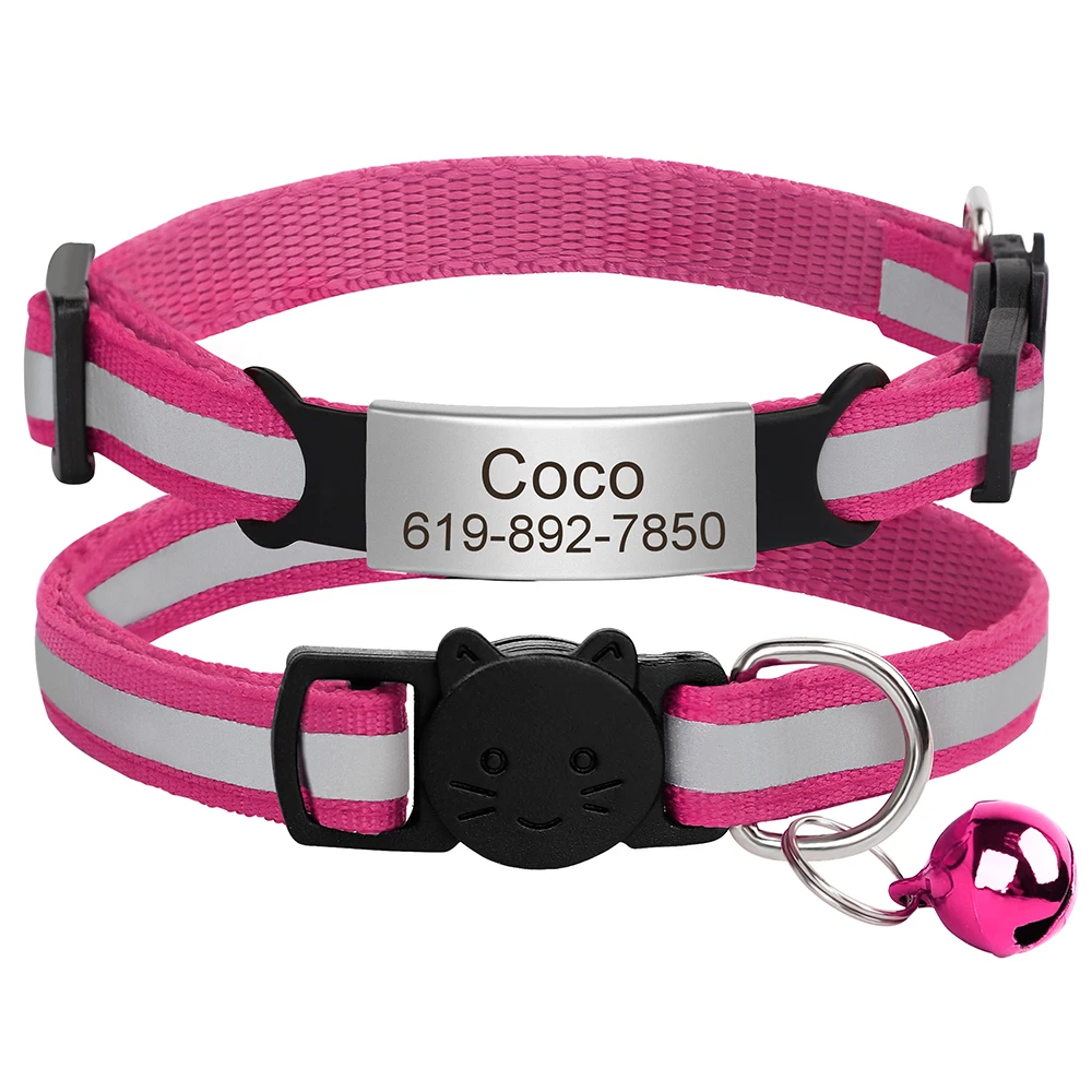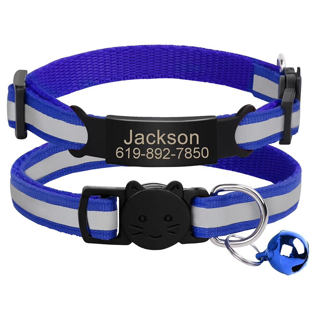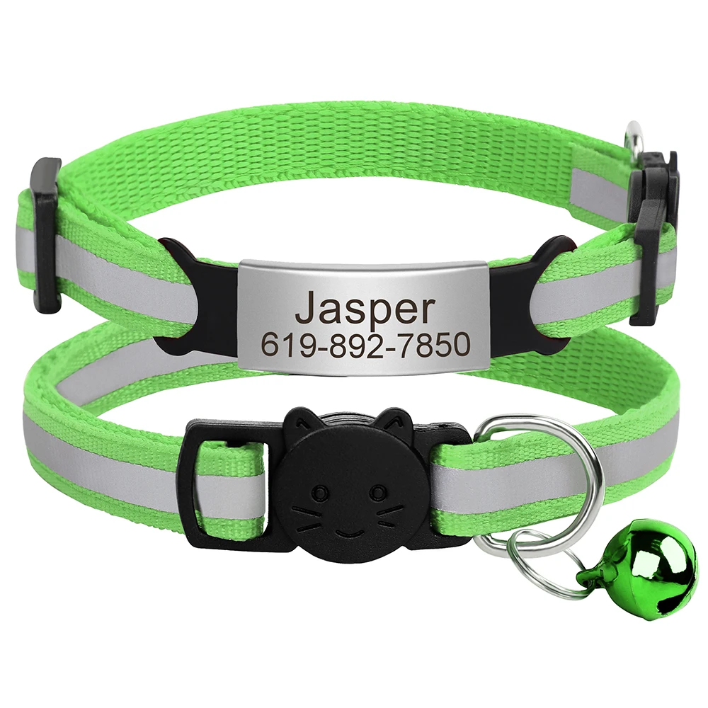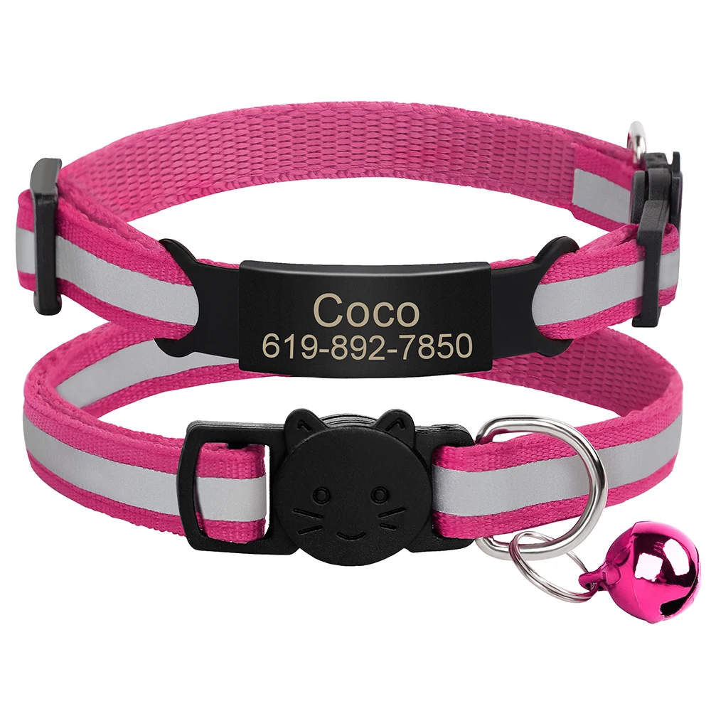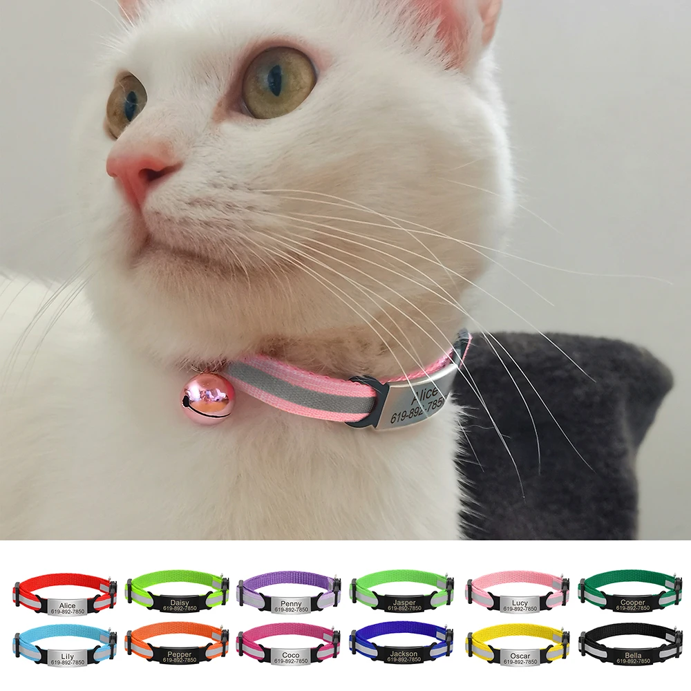 Se ve genial. Nombre del gato con número de teléfono grabado. Durante 5 meses tuve que usar la talla más pequeña, pero se puede ajustar. El color es agradable y la tira reflectante es visible.