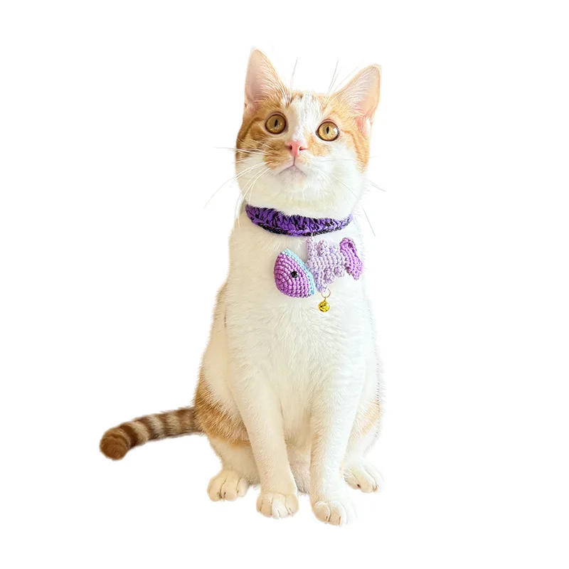 Collar de gato hecho a mano, colgante de murciélago de pescado de ganchillo, bufanda de punto púrpura para perros, Halloween
