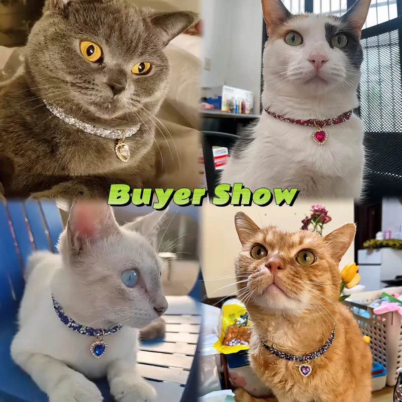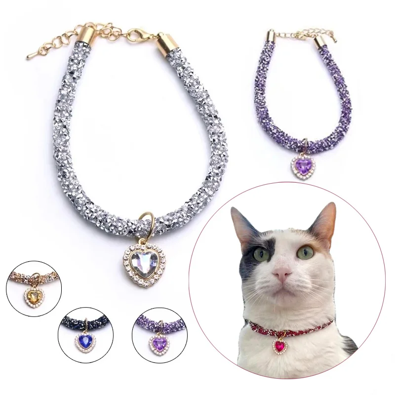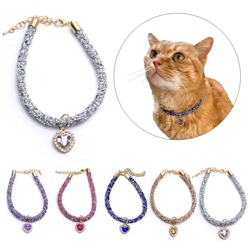 Este collar de lujo para gatos de cristal brillante presenta un colgante de piedras preciosas en forma de corazón y un collar de diamantes de imitación reflectantes.