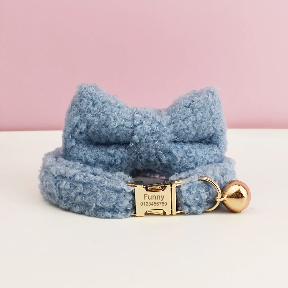 Collar de gato de peluche con placa de nombre, pajarita con campana, collares de gato grabados personalizados para gatos